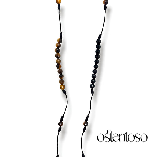 LE ROSARIO : Onyx + Oeil de tigre doré et Croix en or 18 carats.