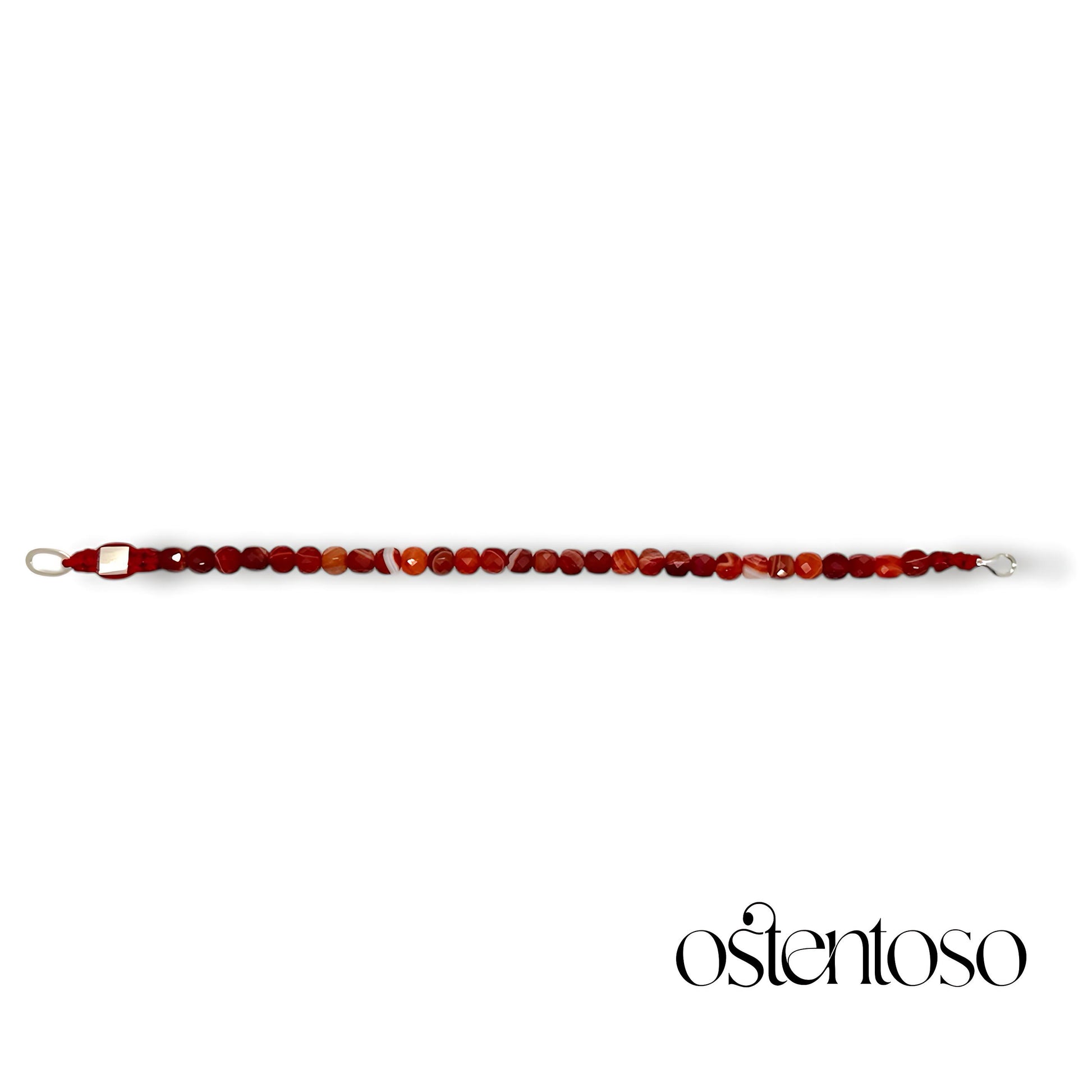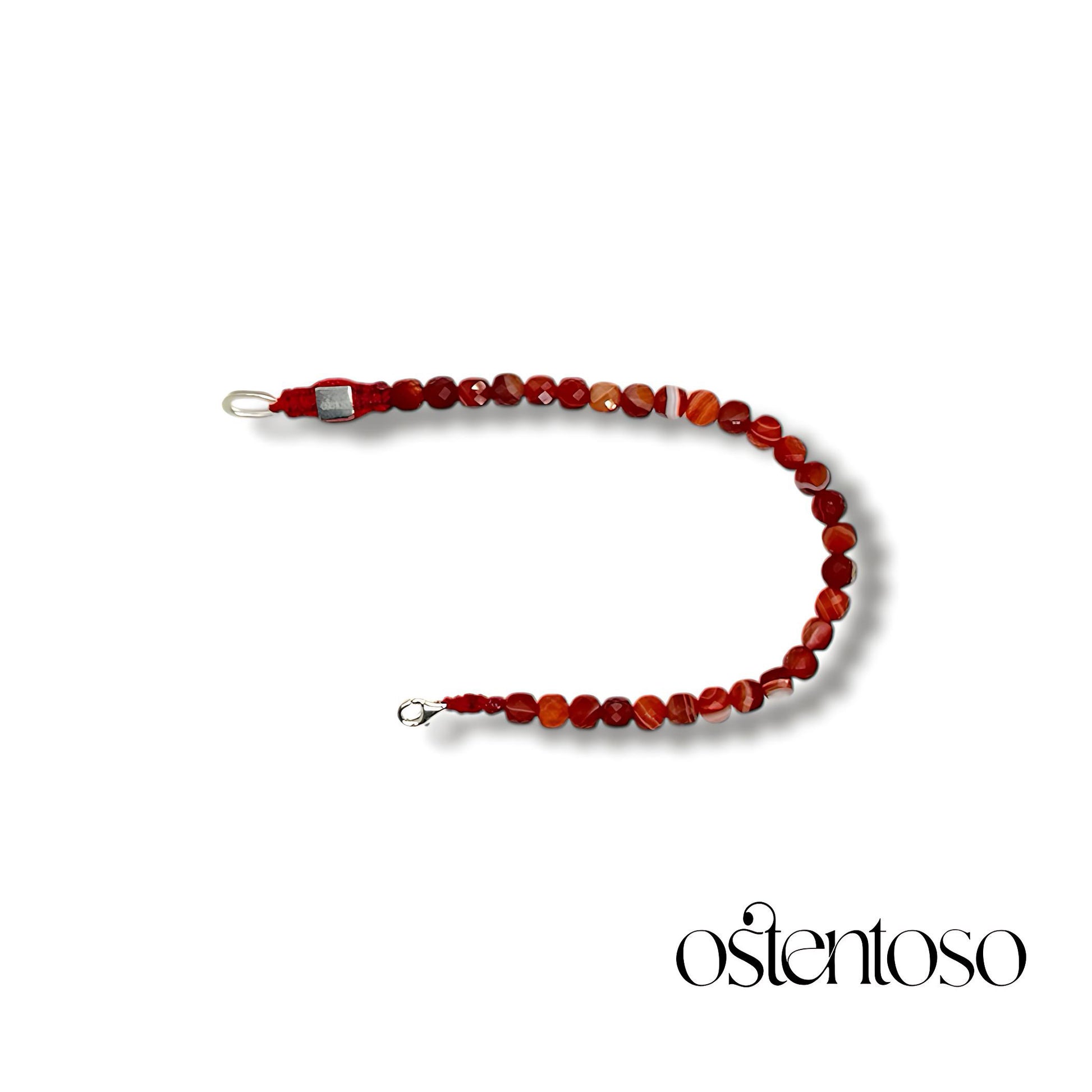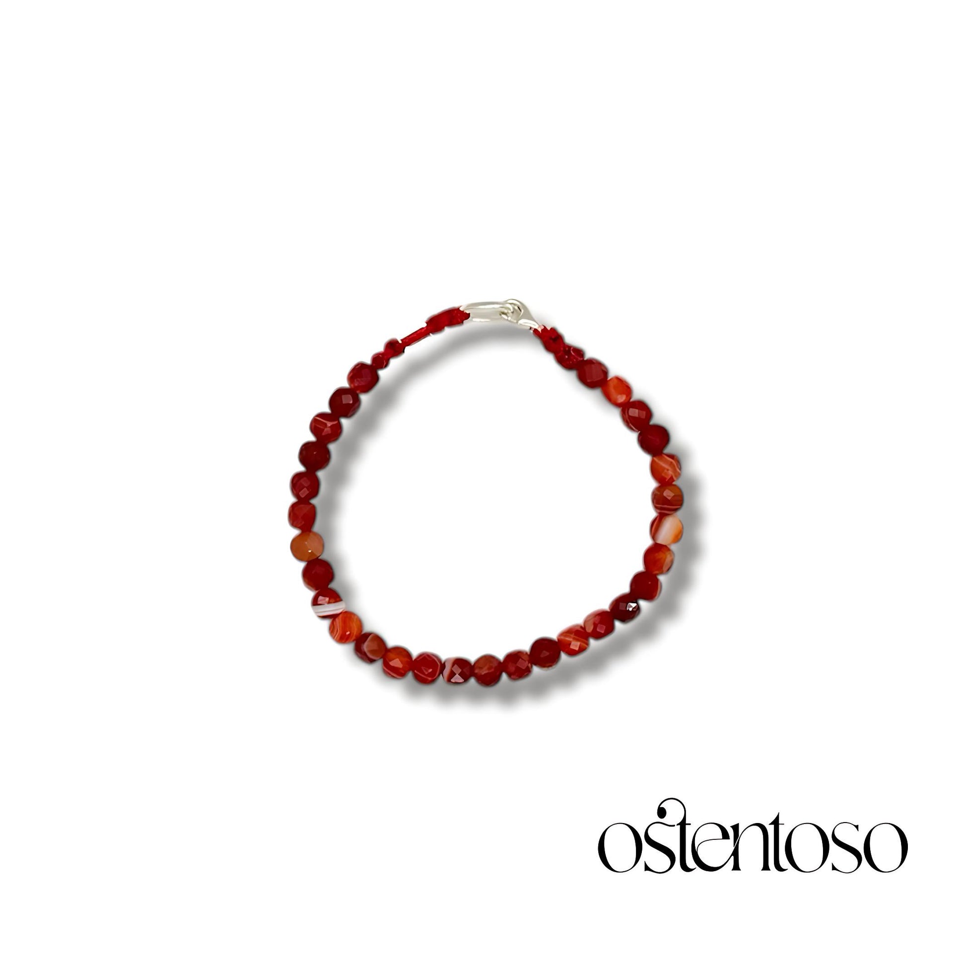 Nuestro hermoso Brazalete está hecho con cristal de Ágata natural, que muestra diferentes formas y tonos de colores rojos, llamadas Bandas rojas cortados en forma cúbicas pulidas en tamaño No. 6 mm, diseñada en versión Básica o con un Balín de Oro de 18 kilates, hecha con cuerda terlenka color según diseño y herrajes en plata Ley 925.
