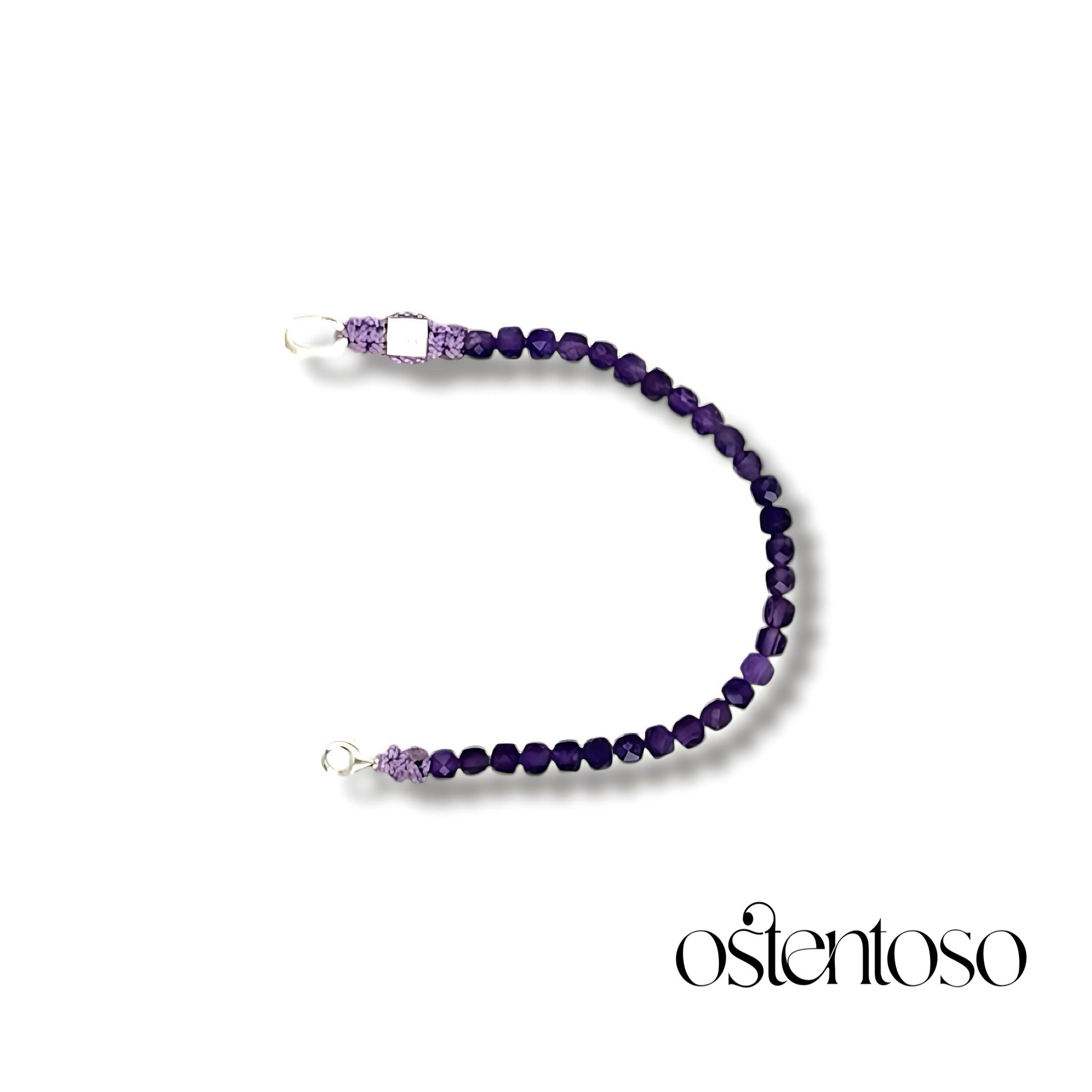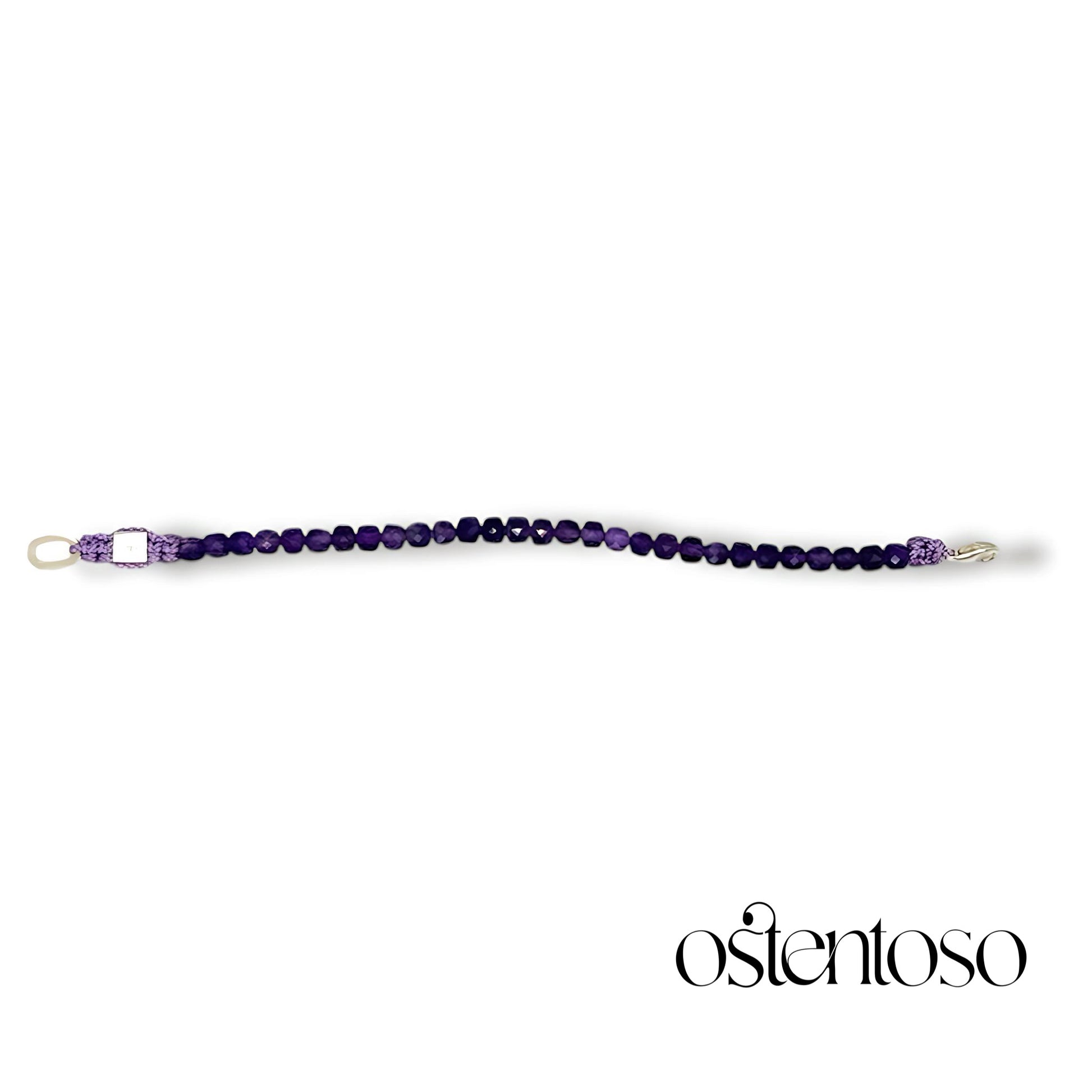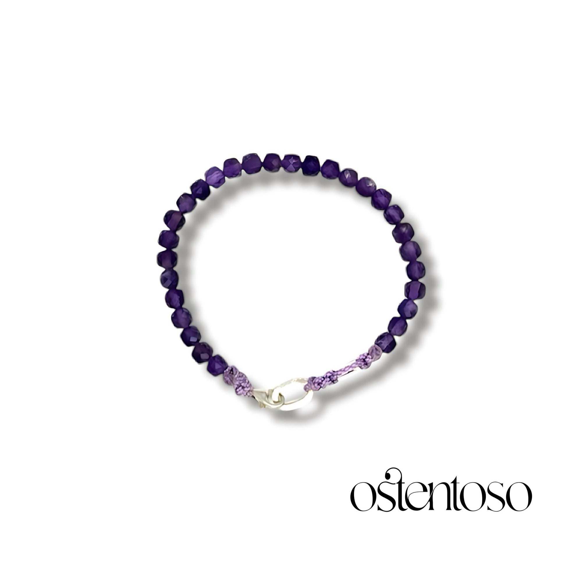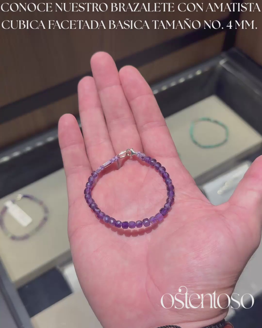Nuestro hermoso Brazalete está hecho con cristales de Amatista natural cortados de forma cúbica facetada en tamaño No. 4 mm, diseñada en versión Básica o con Balin de oro de 18 kilates, y con cuerda terlenka color según diseño; sus broches están hechos con plata Ley 925.