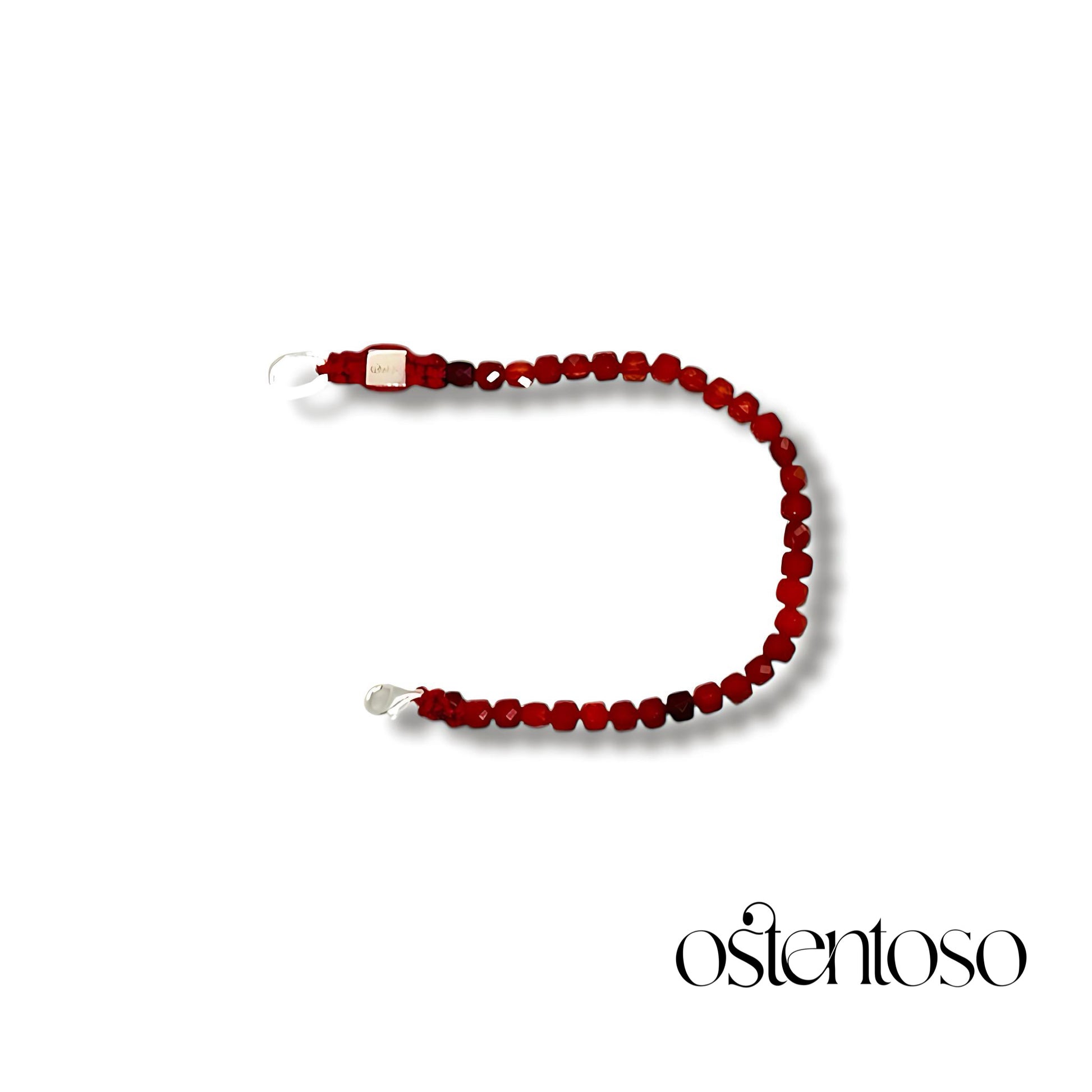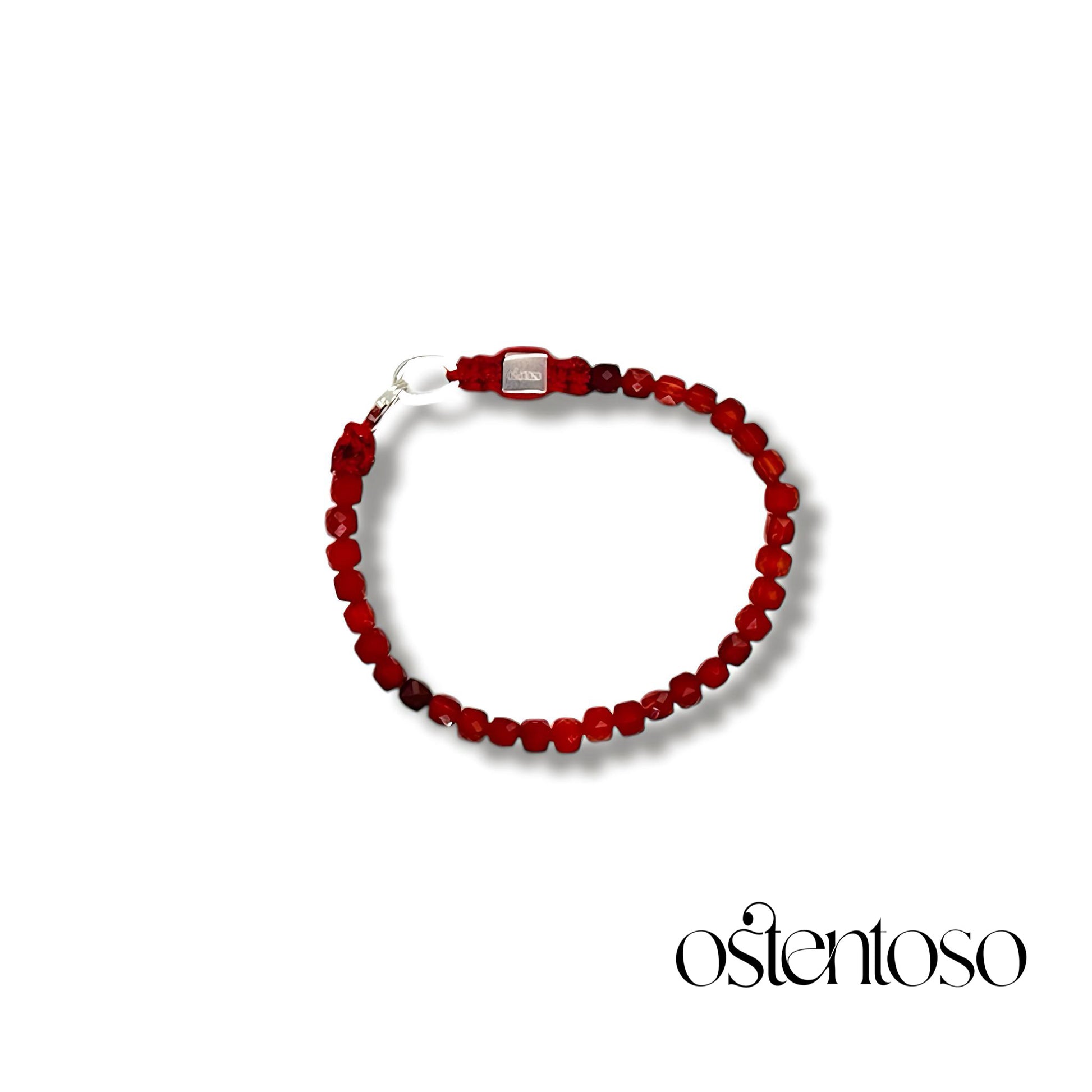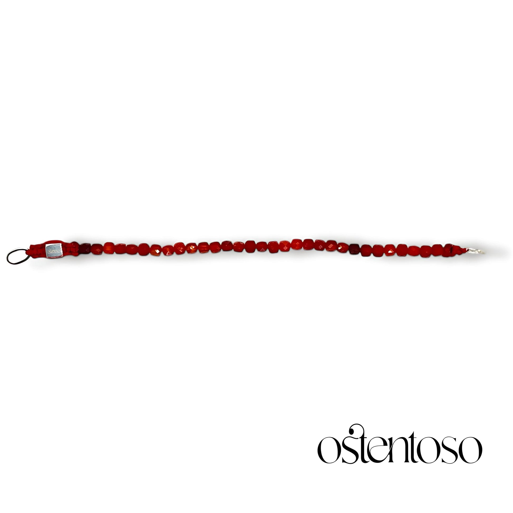 Notre magnifique bracelet est réalisé avec des cristaux de cornaline veinés taillés en forme cubique polie de taille n° 4 mm, conçu dans sa version avec perle en Or 18 carats et corde terlenka colorée selon le design.