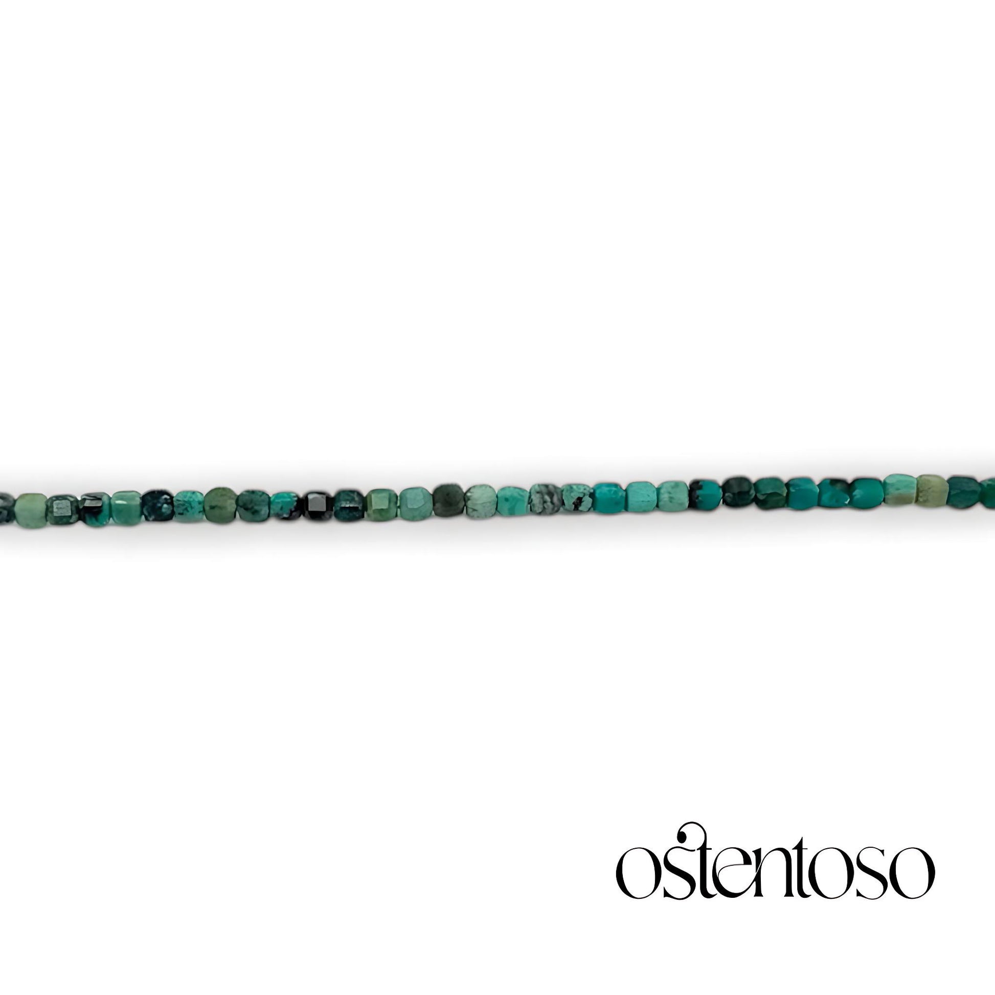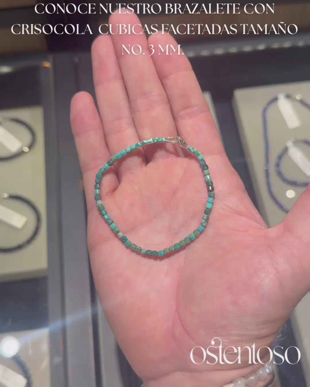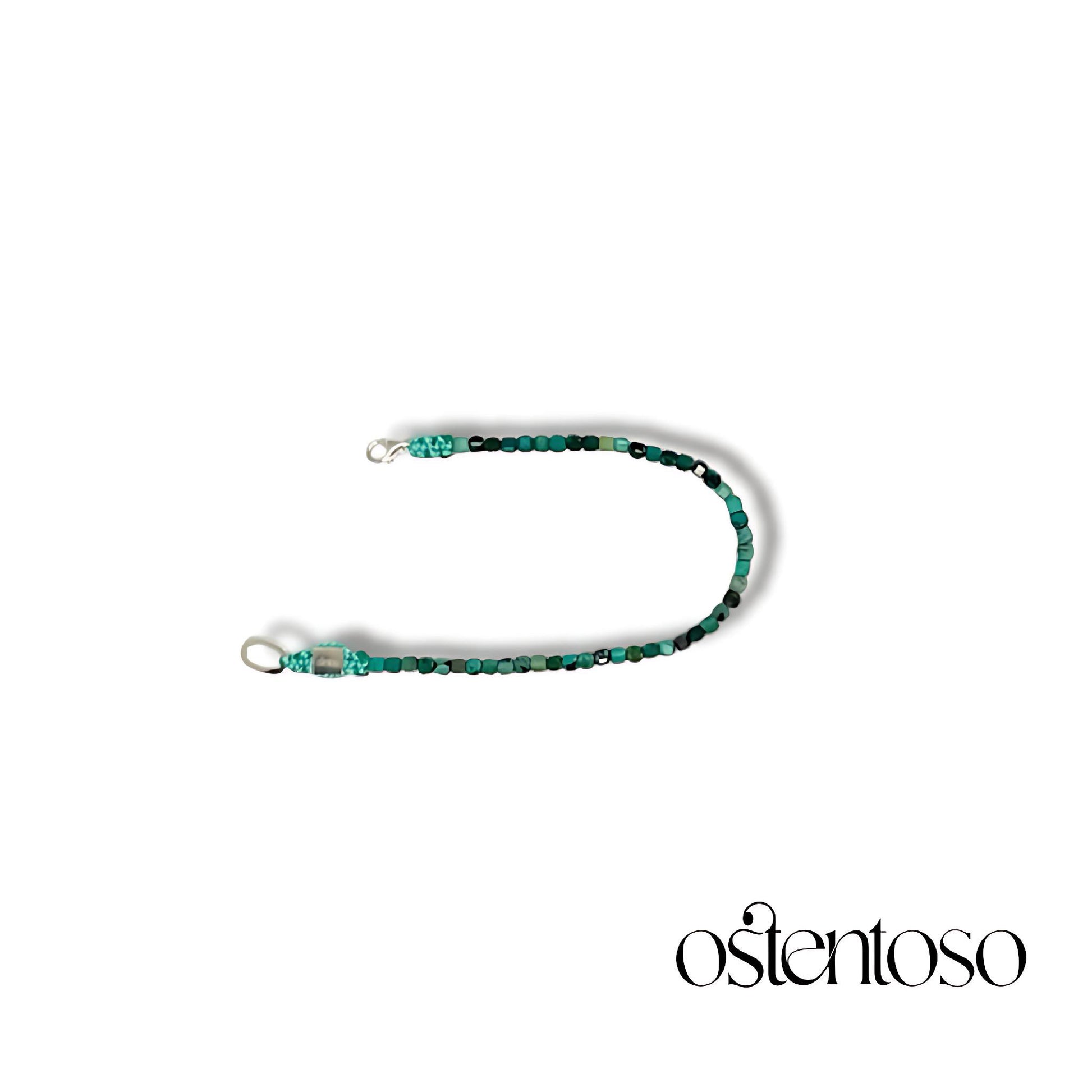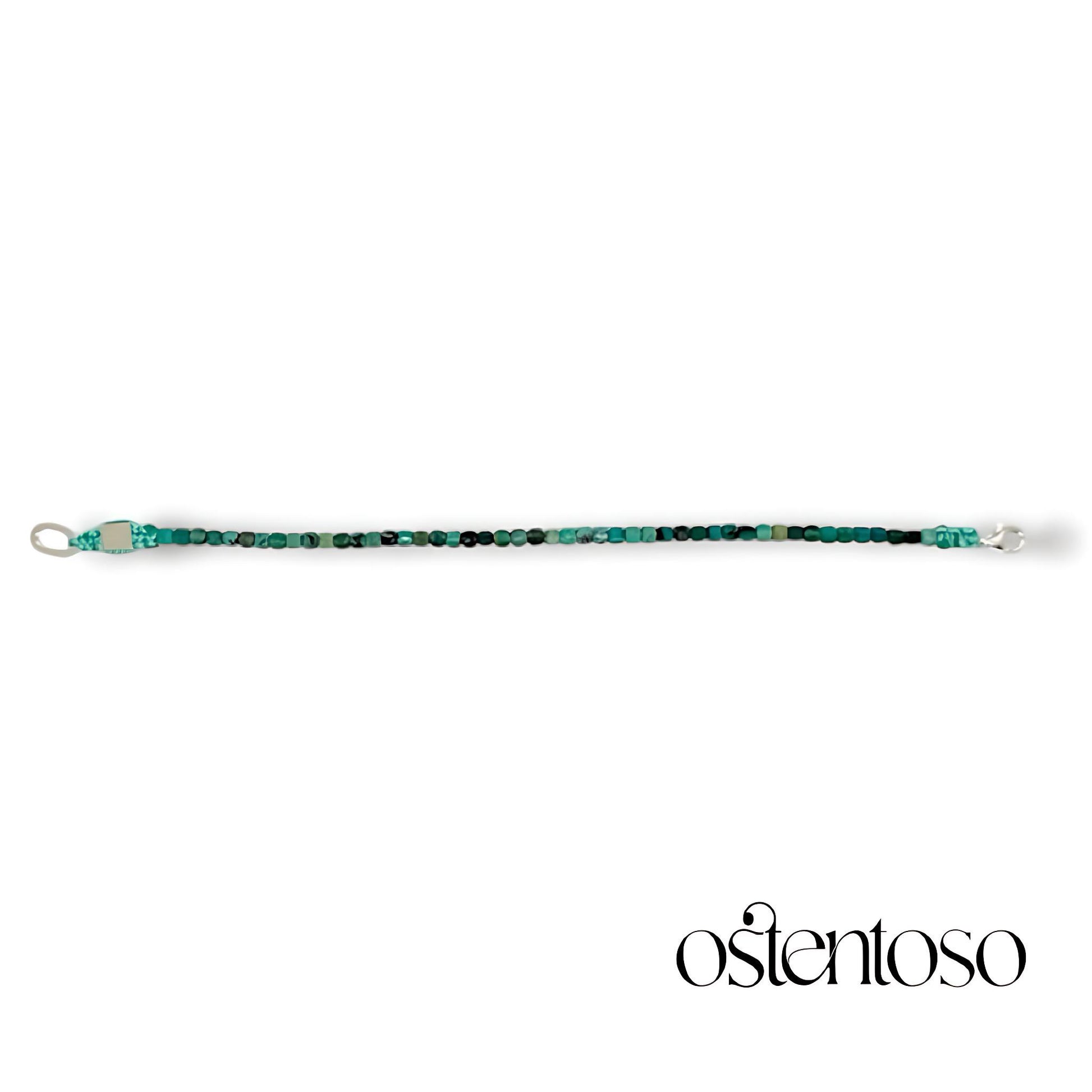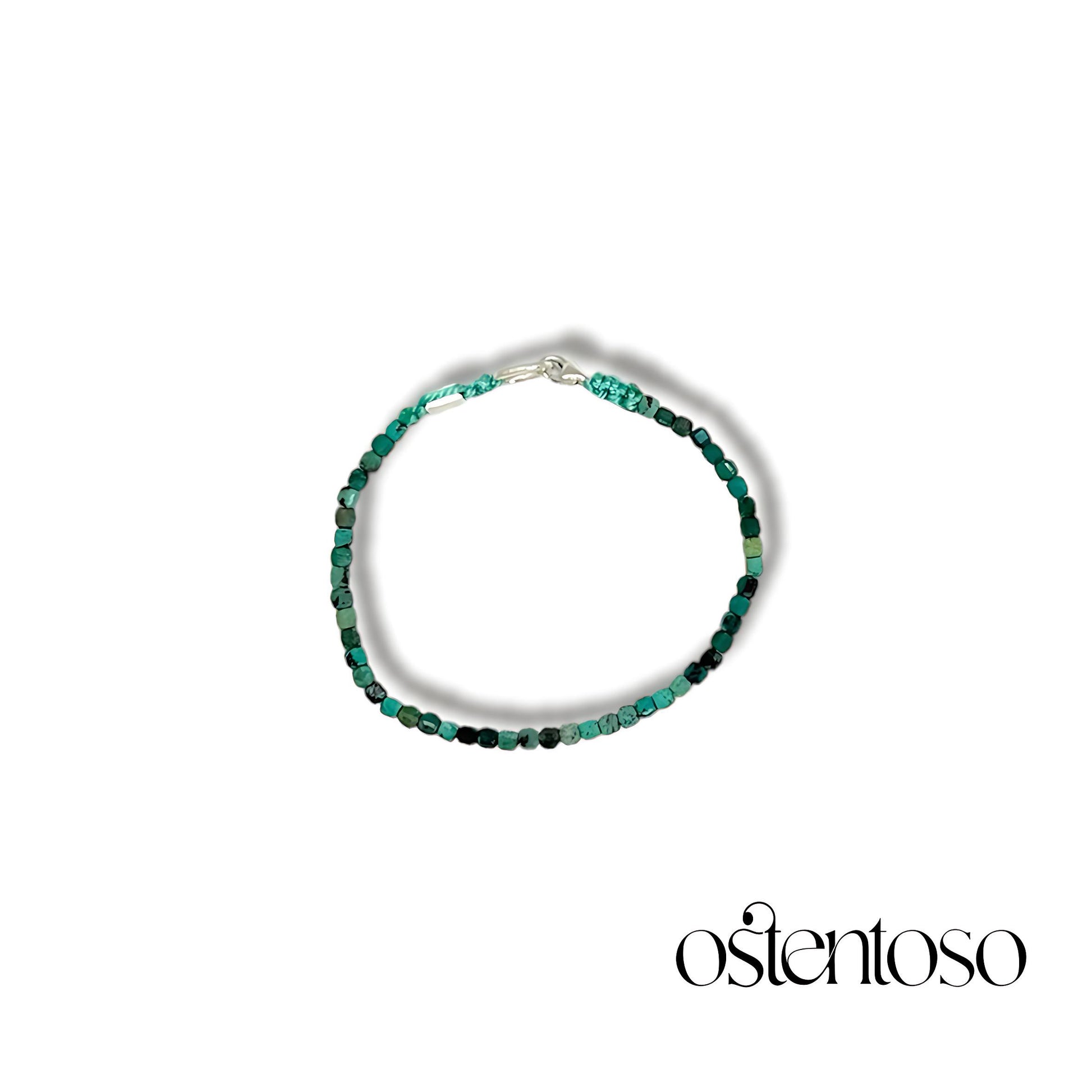 Nuestro hermoso Brazalete está hecho con Roca mineral de Crisocola natural cortados de forma cúbica facetada en tamaño No. 3 mm, diseñada en versión Básica, y con cuerda terlenka color según diseño; sus broches están hechos con plata Ley 925.