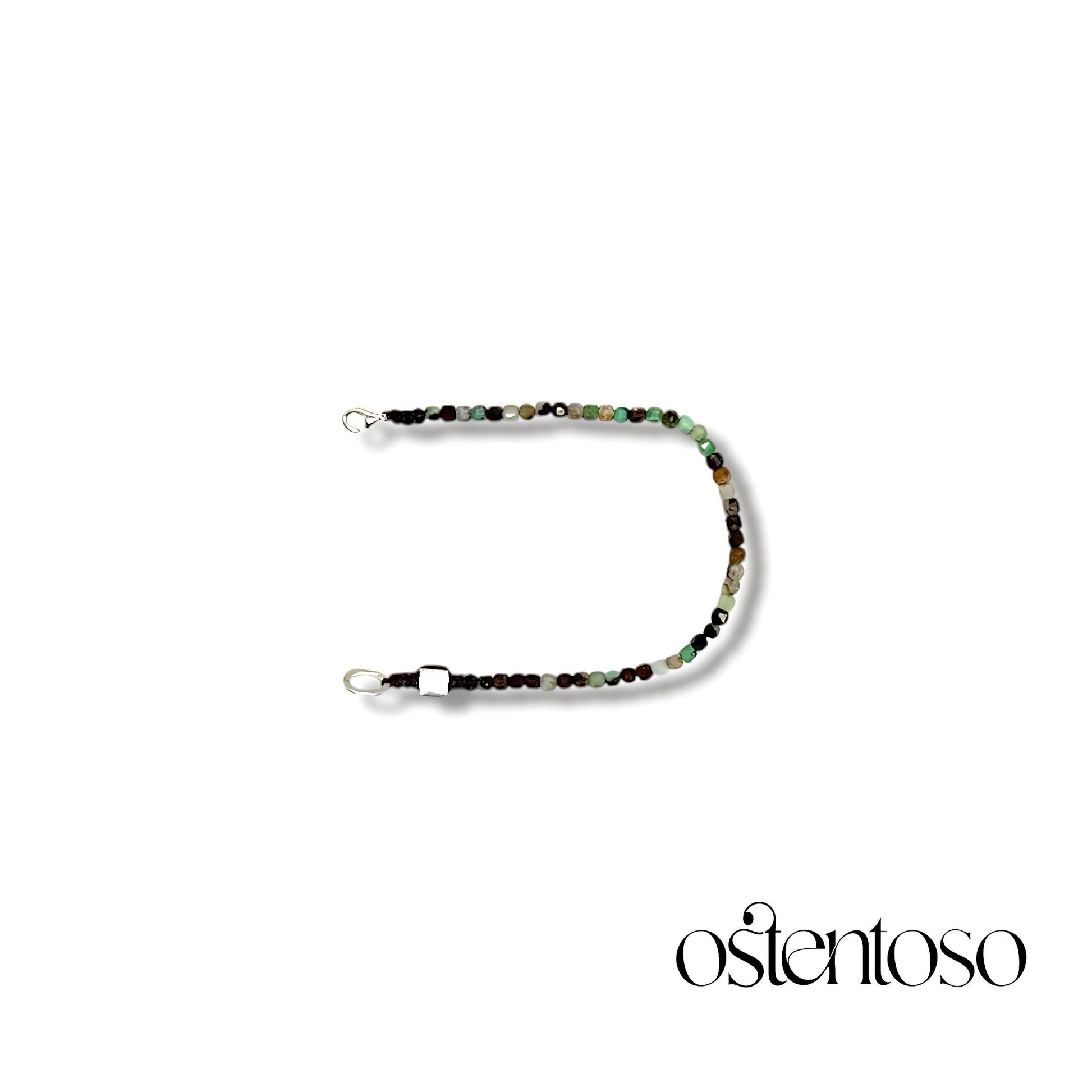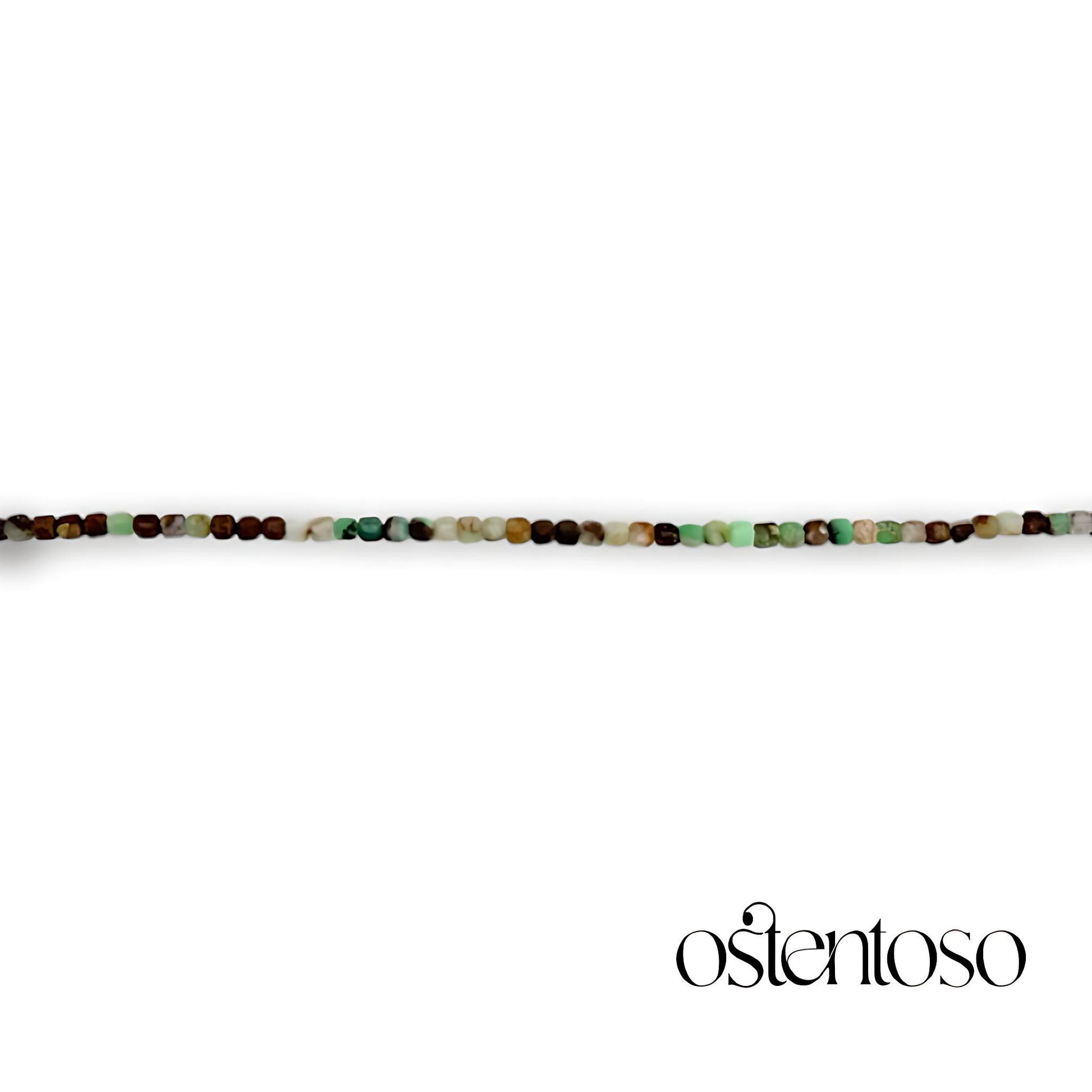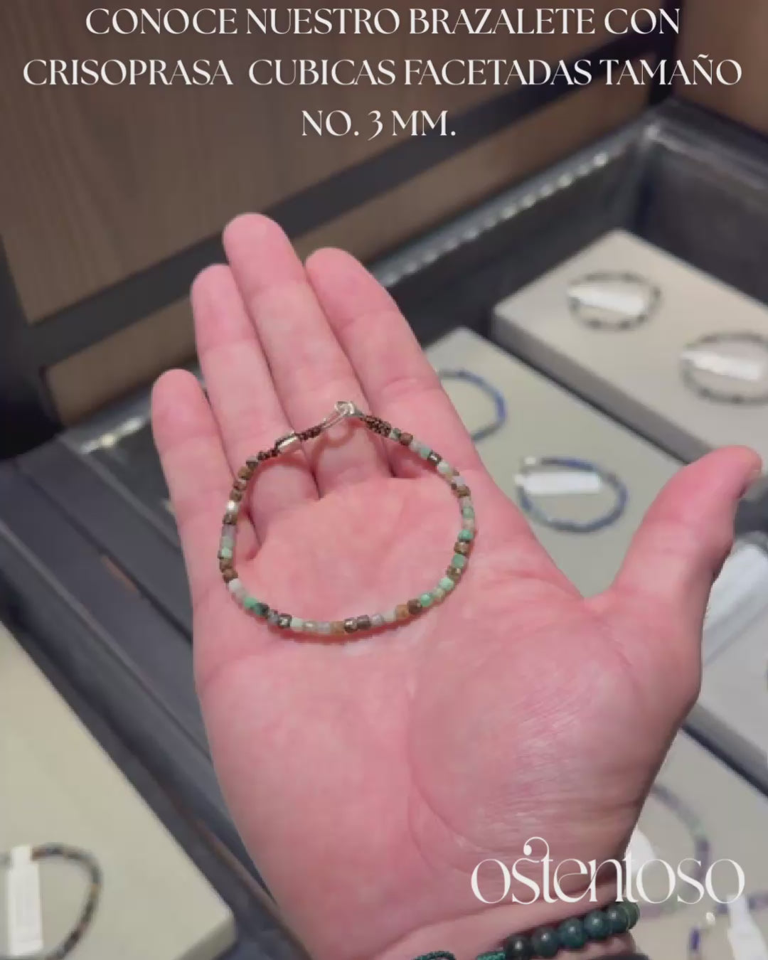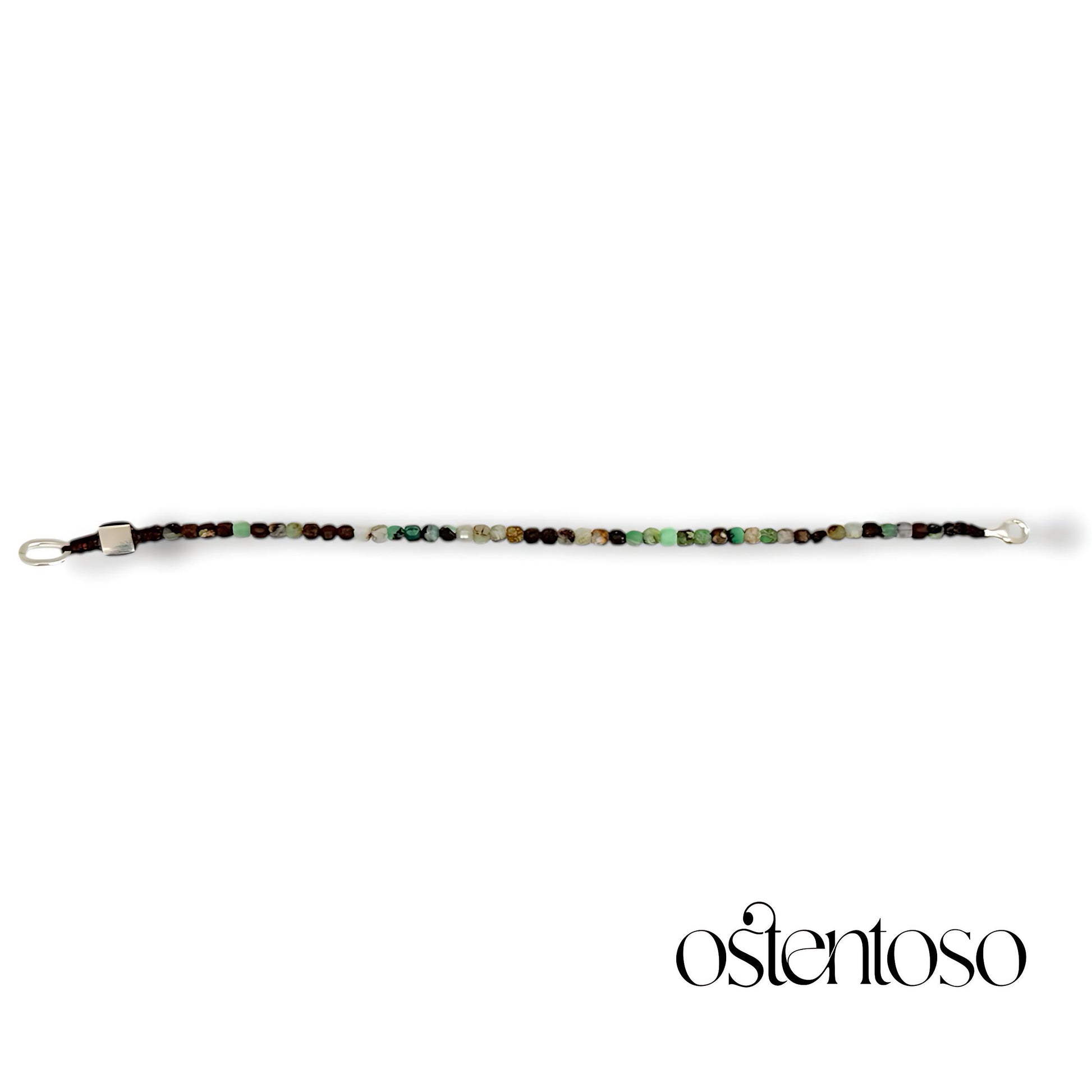 Nuestro hermoso Brazalete está hecho con roca mineral de Crisoprasa verde cortadas de forma cúbica facetada en tamaño No. 3 mm, diseñada en versiones Básica, y cuerda terlenka color según diseño; sus broches están hechos con Plata Ley 925.
