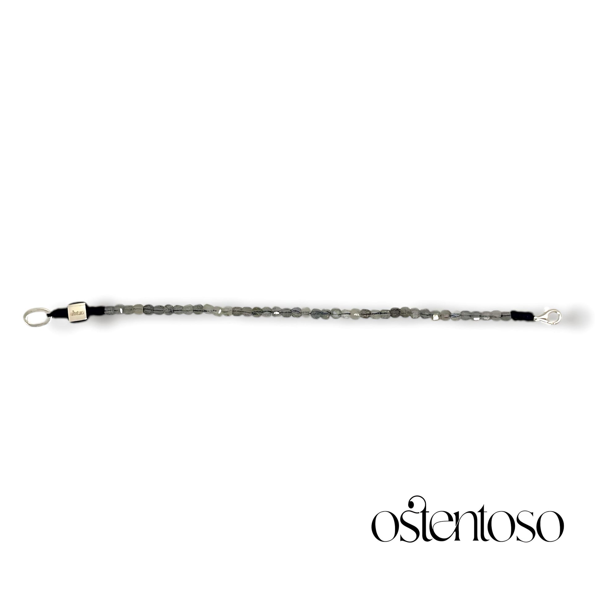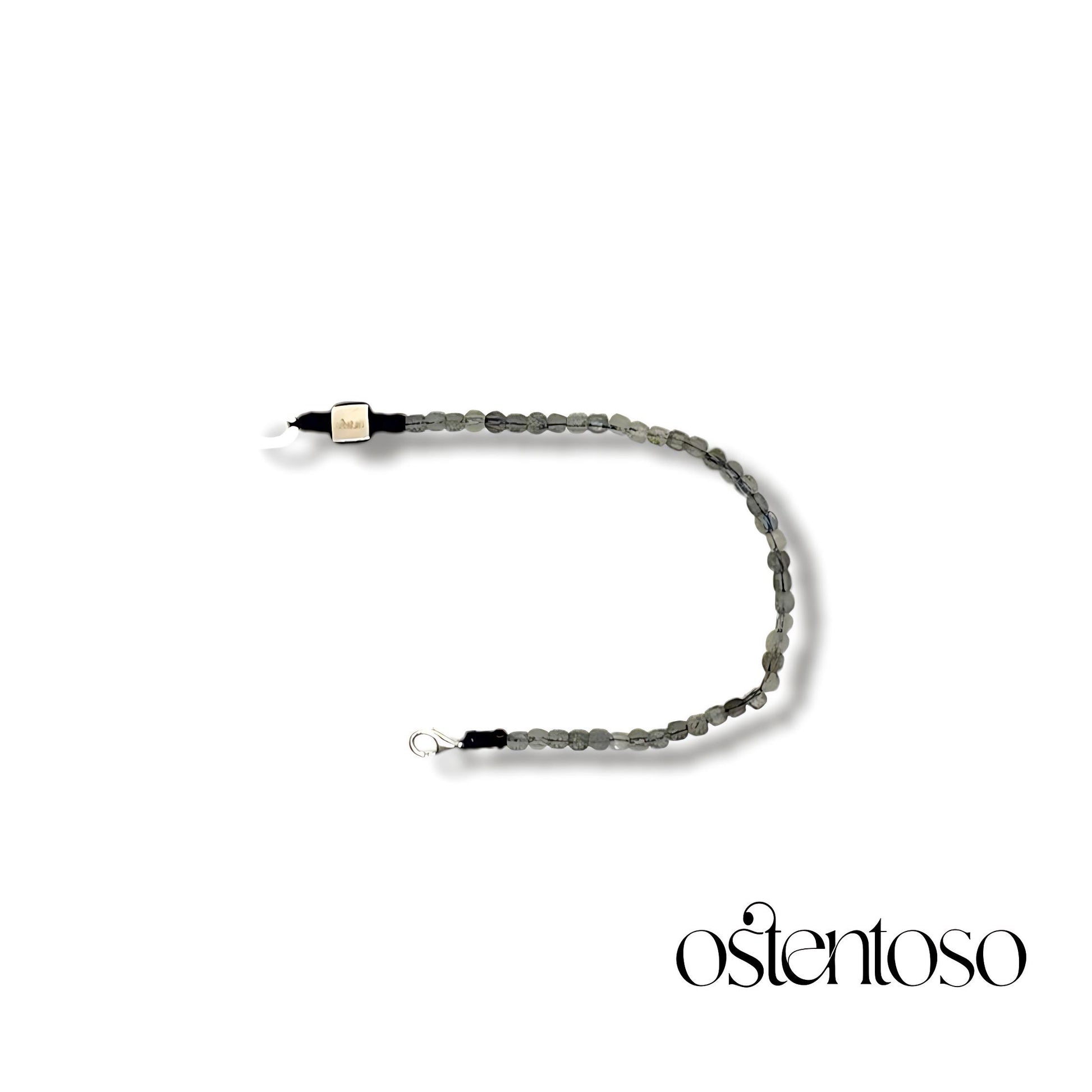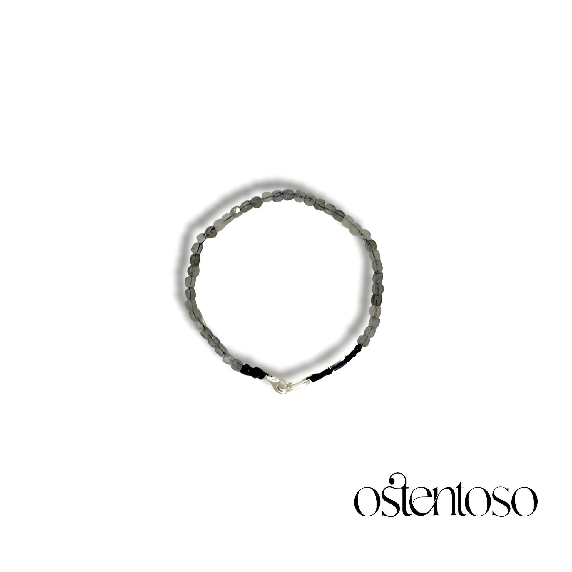 Nuestro hermoso Brazalete está hecho con Rocas de Labradorita pulida cortadas en forma cúbica facetada en tamaño No. 3 mm, diseñada en su versión Básica, hecha con cuerda terlenka color según diseño y herrajes en plata Ley 925.