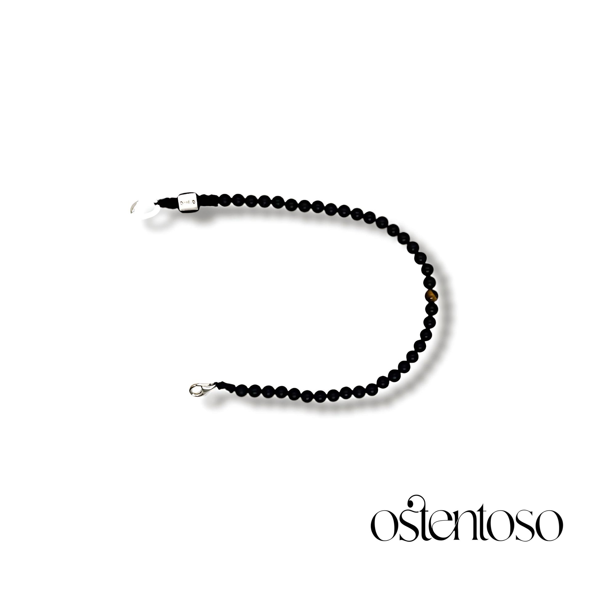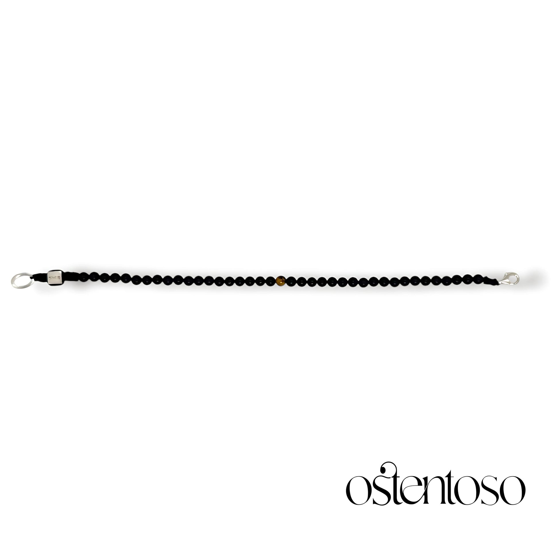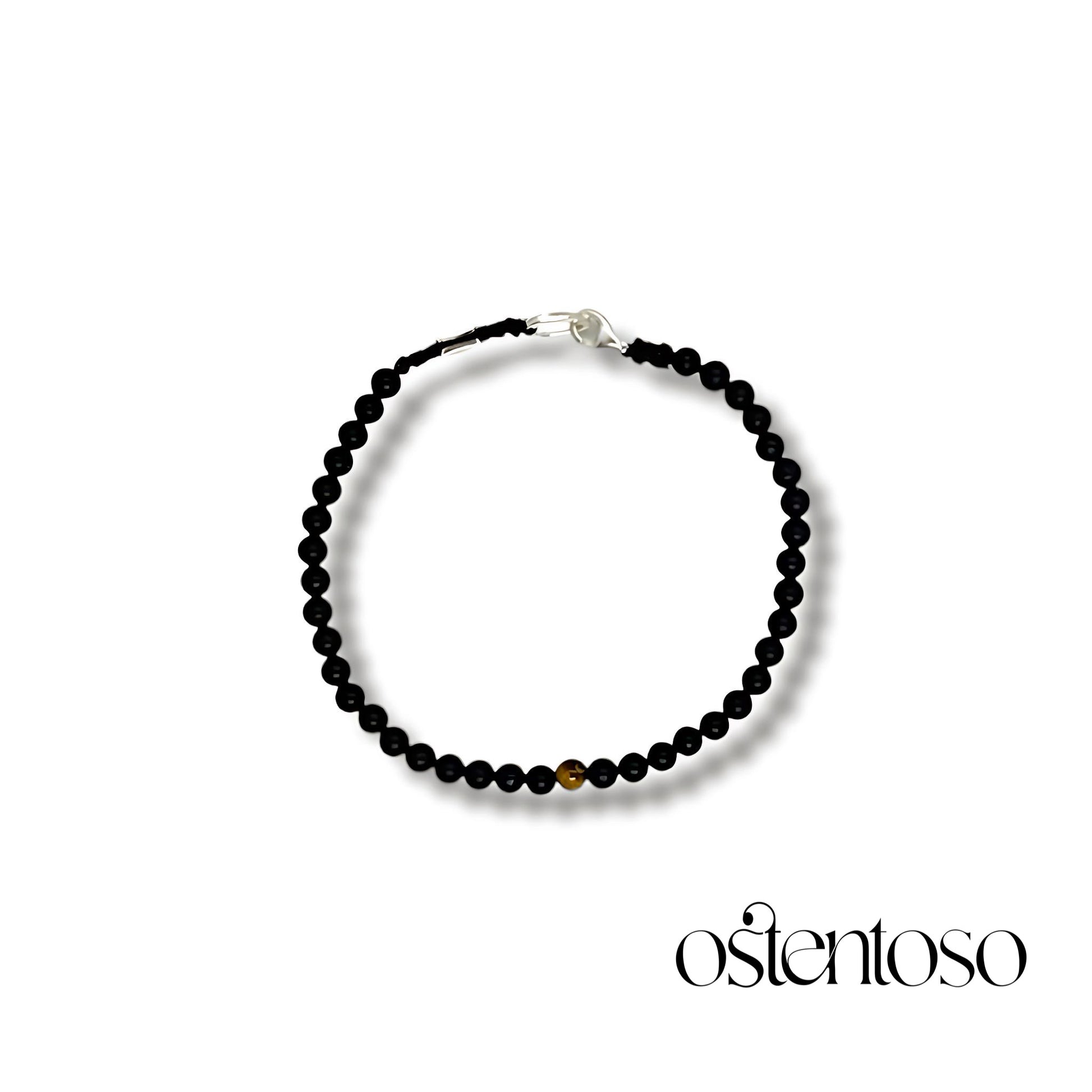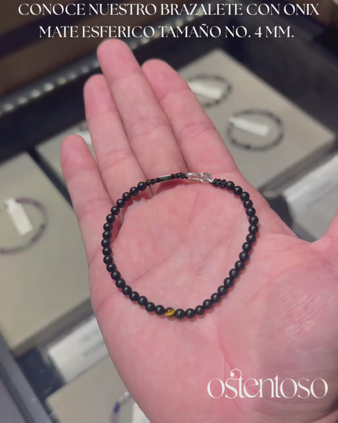 Notre magnifique bracelet est réalisé avec des pierres d'onyx noir mat taillées en forme sphérique de taille n° 4 mm, conçues dans sa version Basic et avec des perles d'or 18 carats, réalisées avec une corde terlenka colorée selon le design ; Leurs broches sont en argent sterling 925.