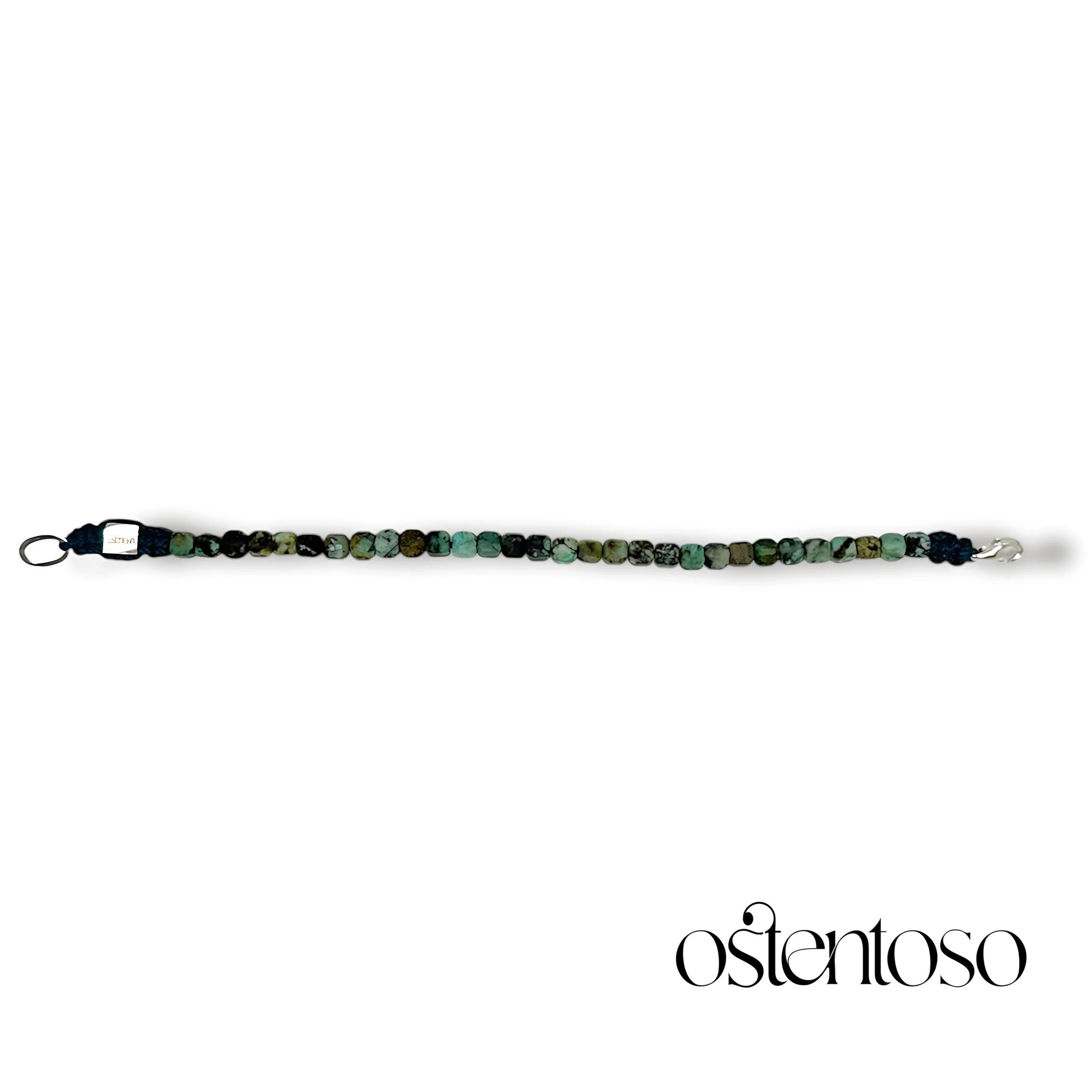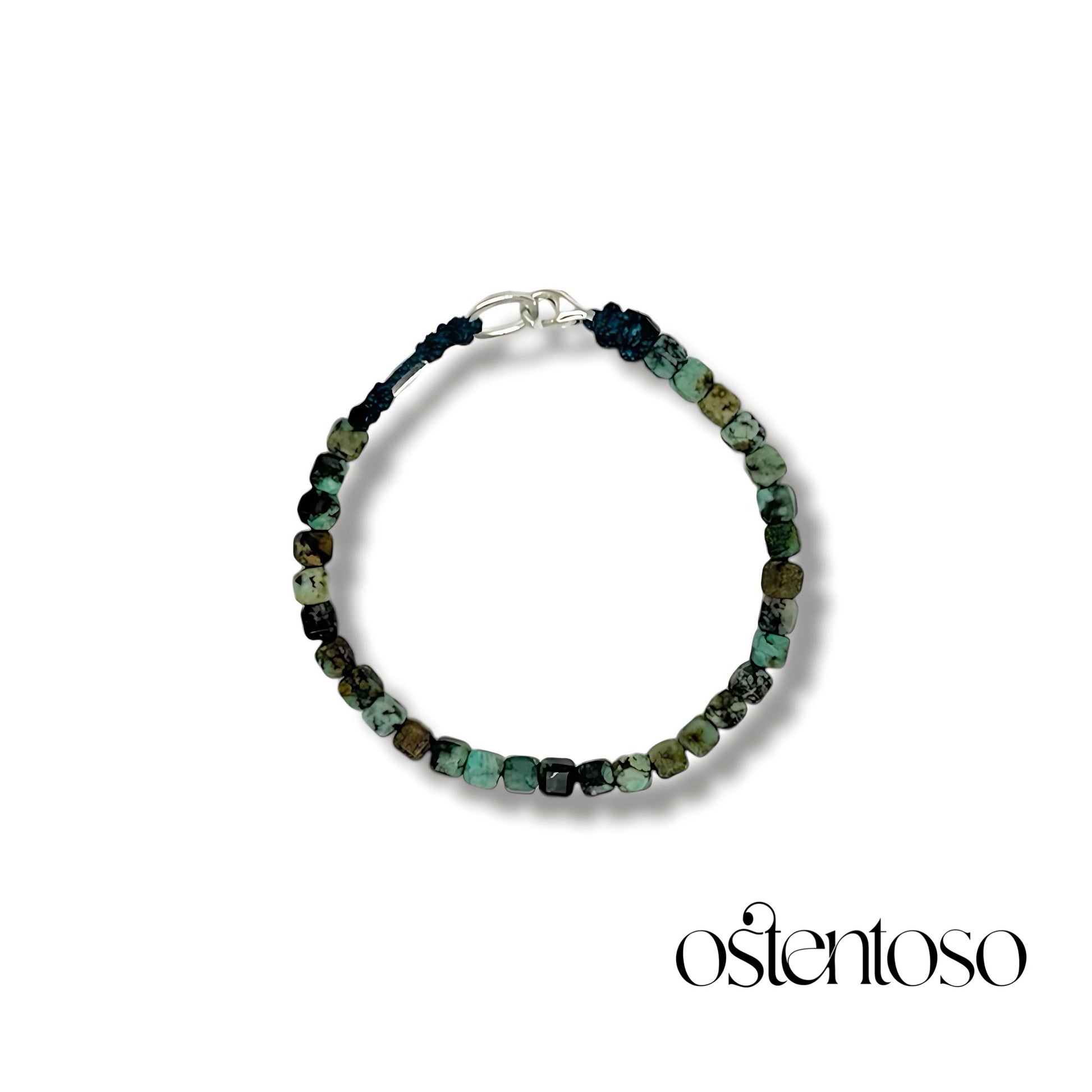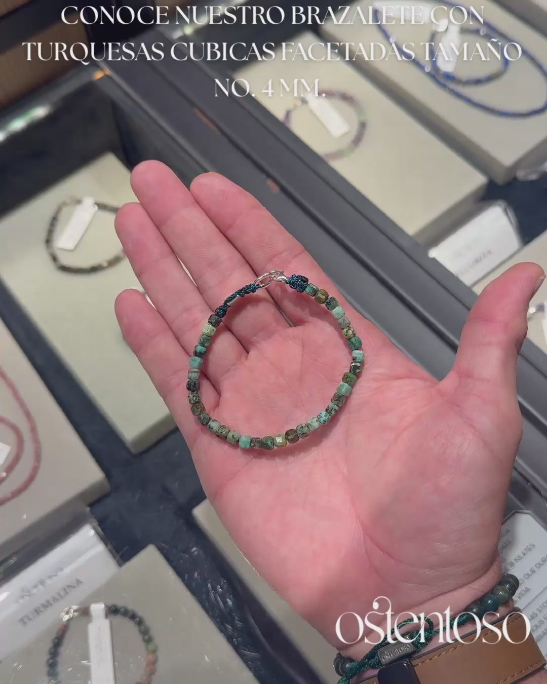 Notre magnifique bracelet est composé de roches minérales turquoise africaines de taille cubique de taille n° 4 mm, conçues dans ses versions Basic et avec une boule en or 18 carats, et une corde terlenka colorée selon le design ; Leurs broches sont en argent sterling 925.