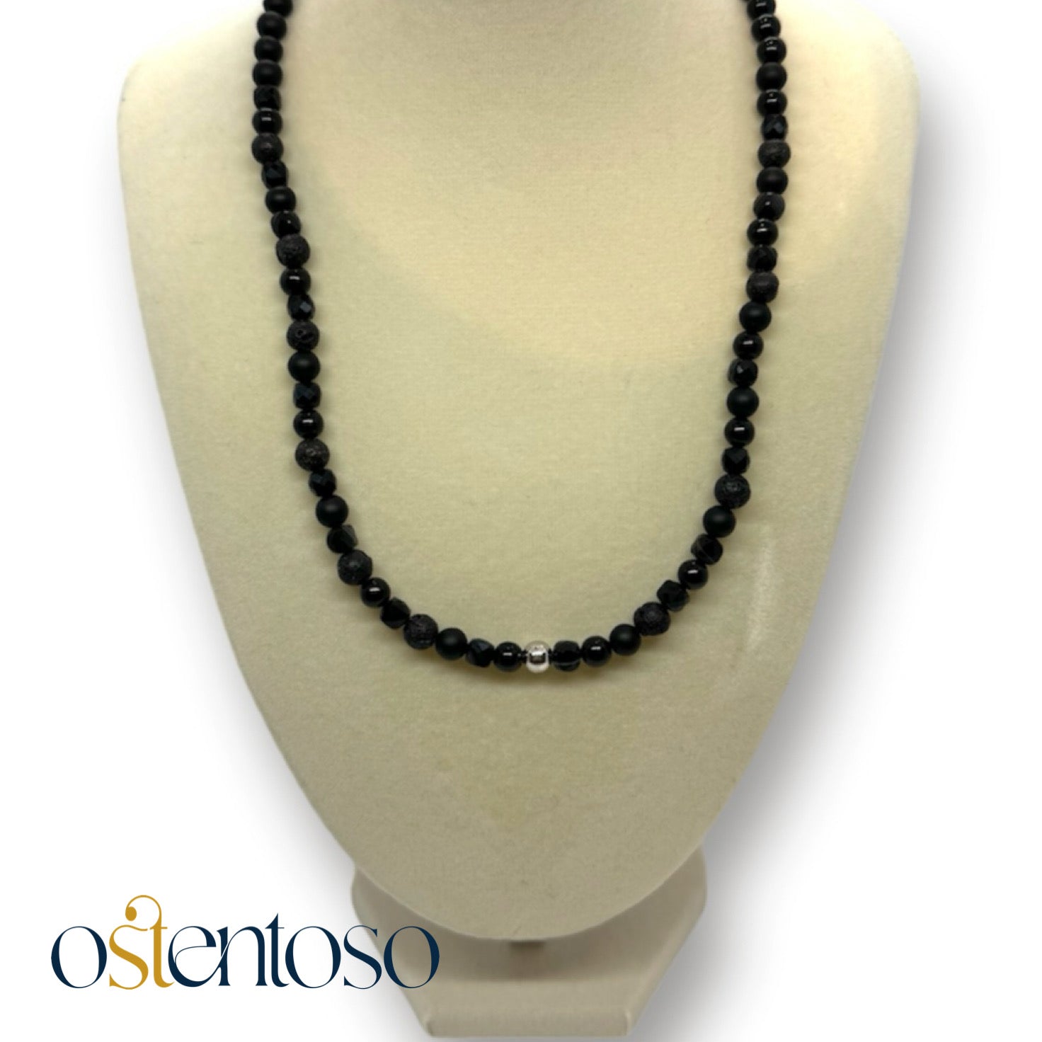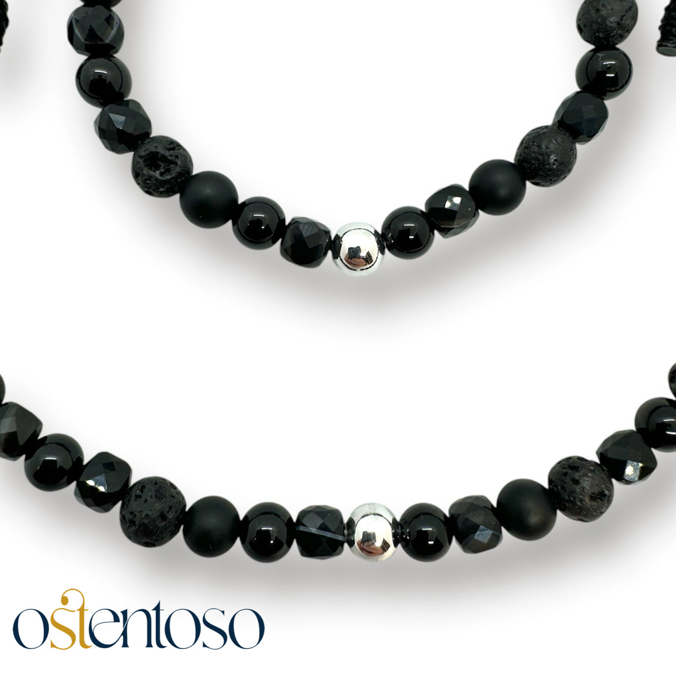 Hamza propose un mélange de pierres précieuses organisées : onyx brillant, roche volcanique, onyx mat, sardonice cubique, et nous centrons l'accessoire avec une boule en or blanc 18 carats.