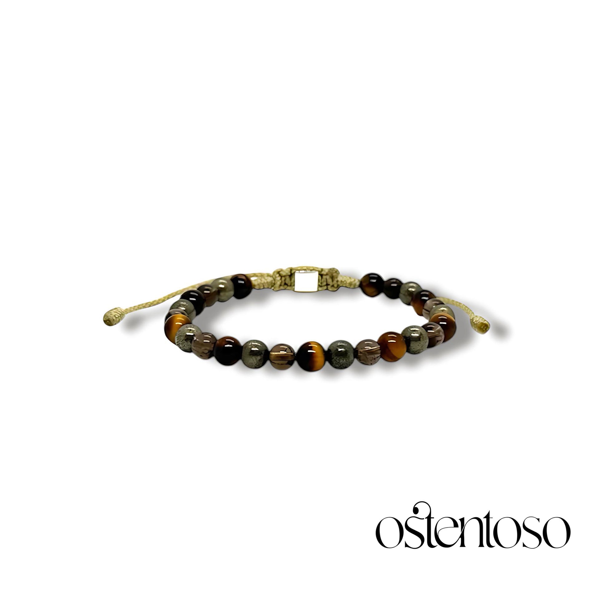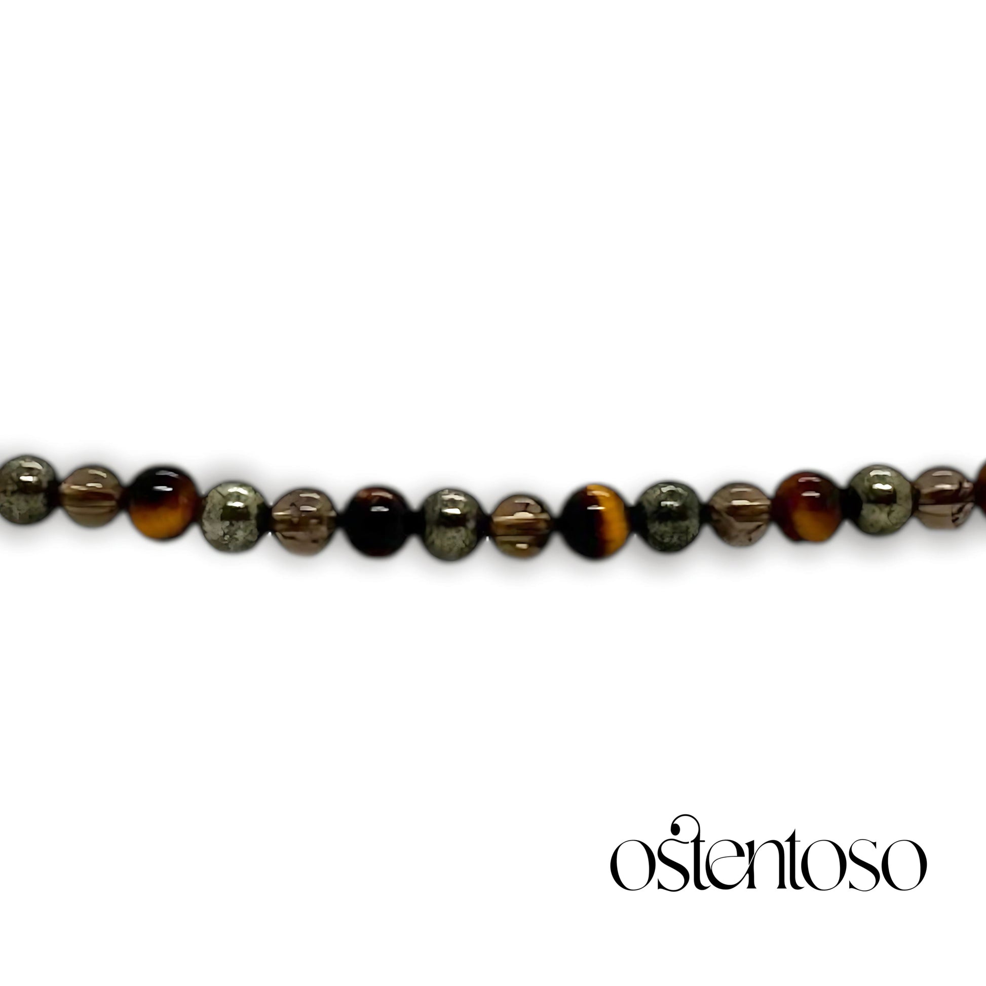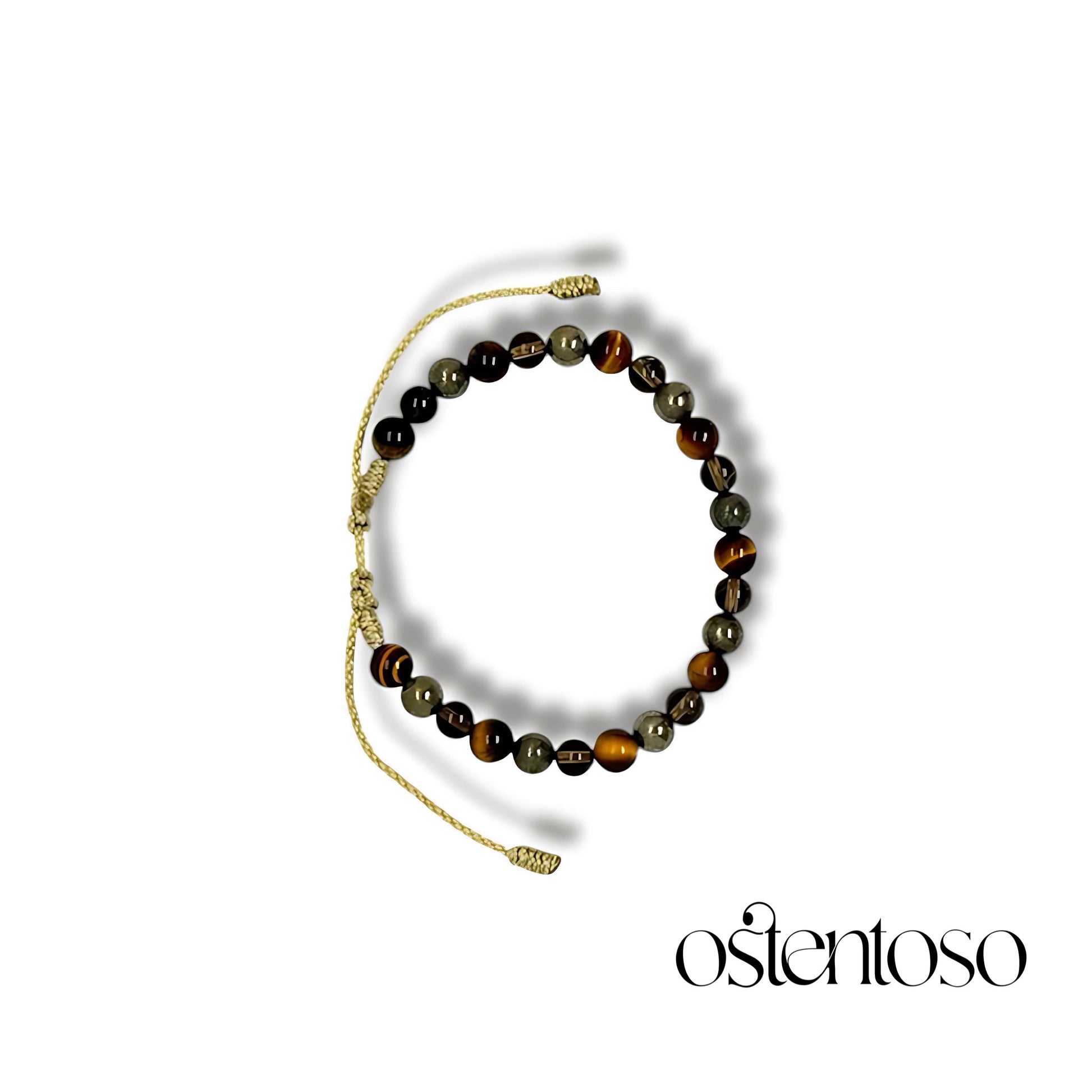 Il s'agit d'un bracelet composé de trois pierres semi-précieuses : l'œil de tigre doré, le quartz fumé et la pyrite. Ces Gemmes décrivent dans leur sens une personne forte dans tous les sens du terme, qui ne passe pas inaperçue.