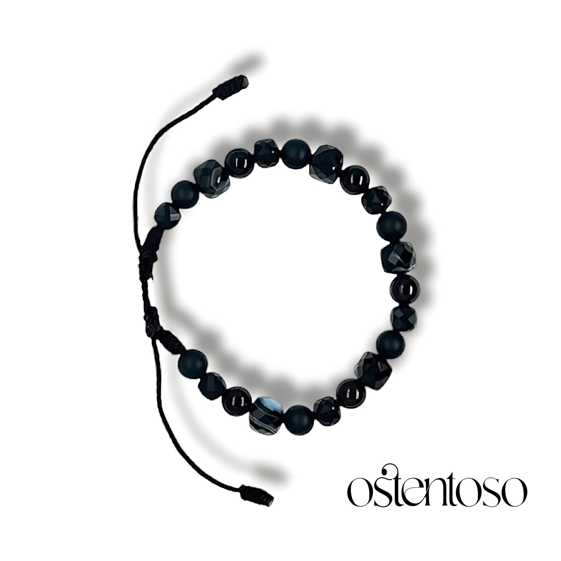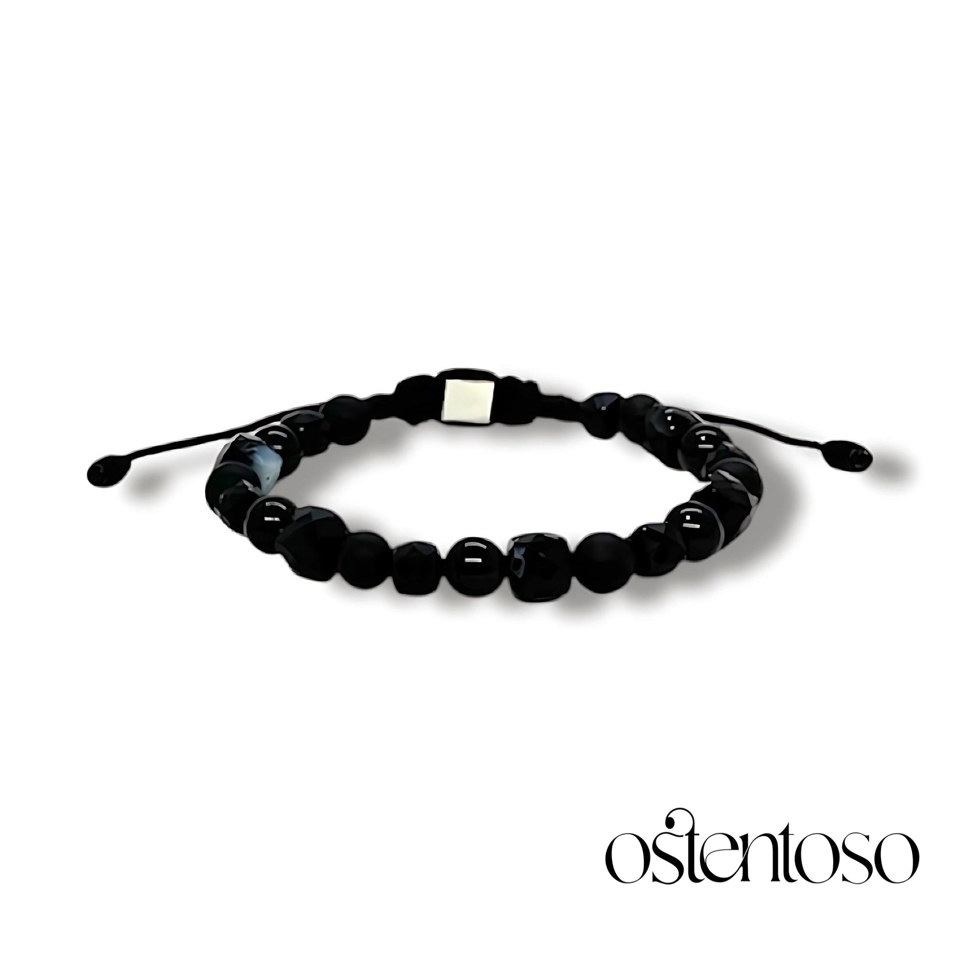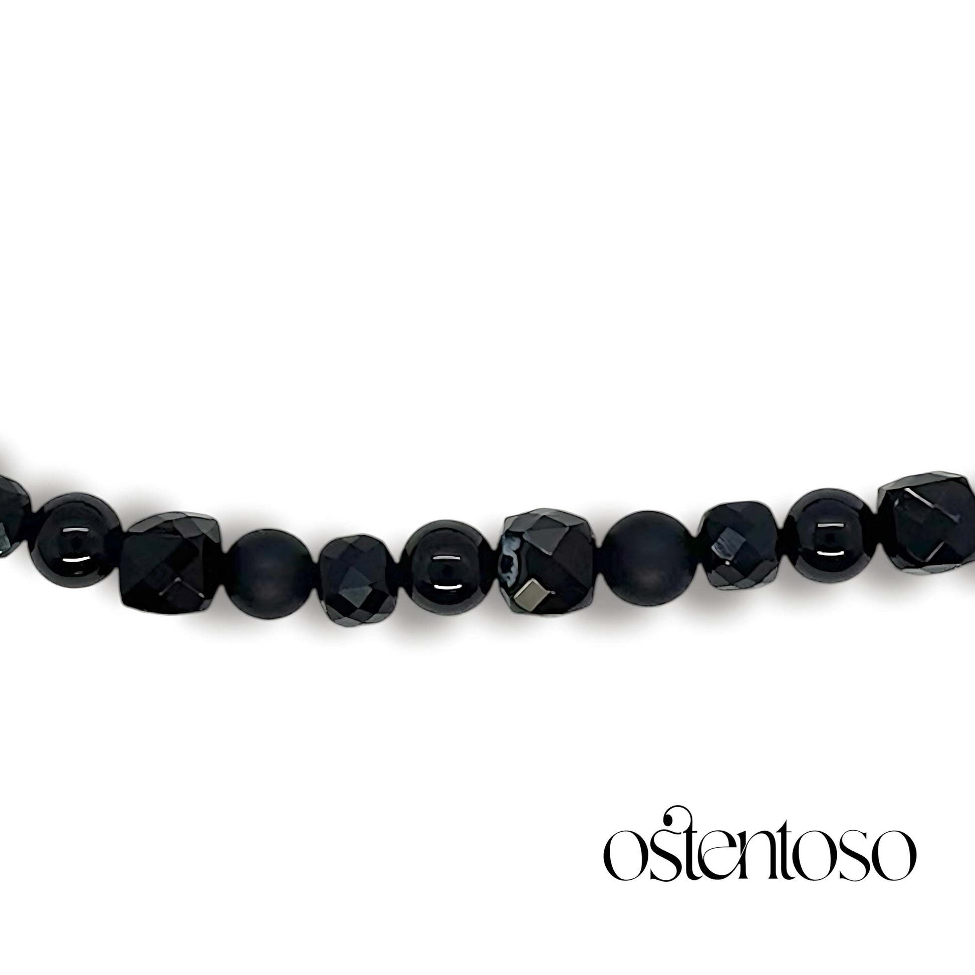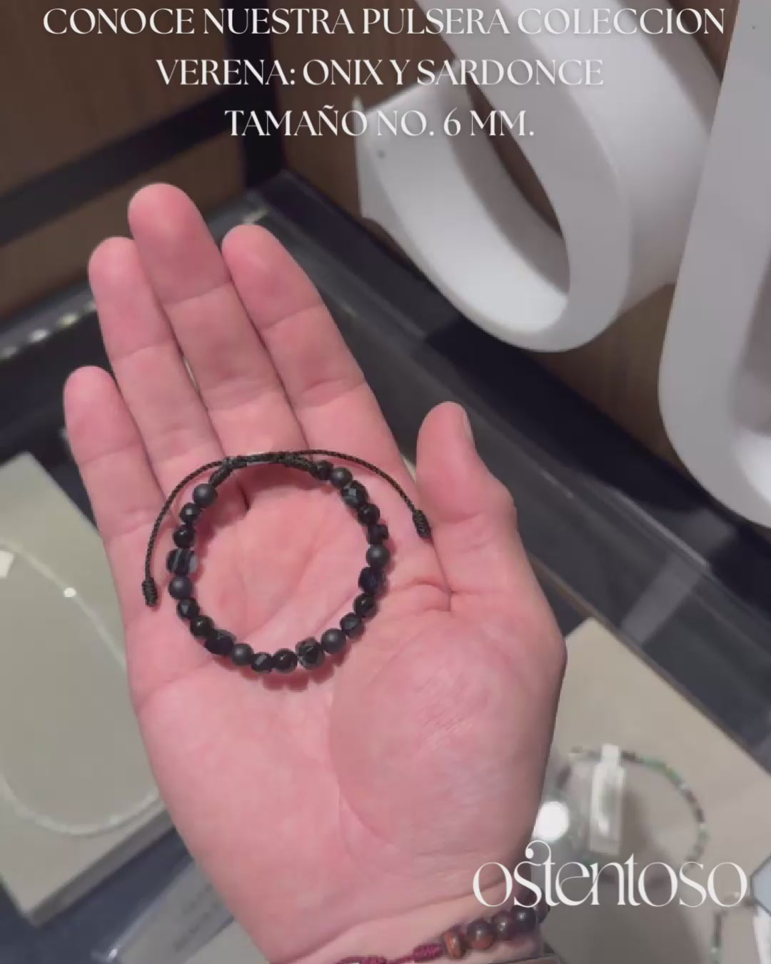 Verena posee un mix de Gemas organizadas: Onix brillante, Onix mate, sardonice cubico, y puedes escoger tu accesorio en modo básico o centrar en tu accesorio Verena un Balín de Oro blanco de 18 kilates para hacer mas elegante o exclusiva tu prenda, tú escoges!