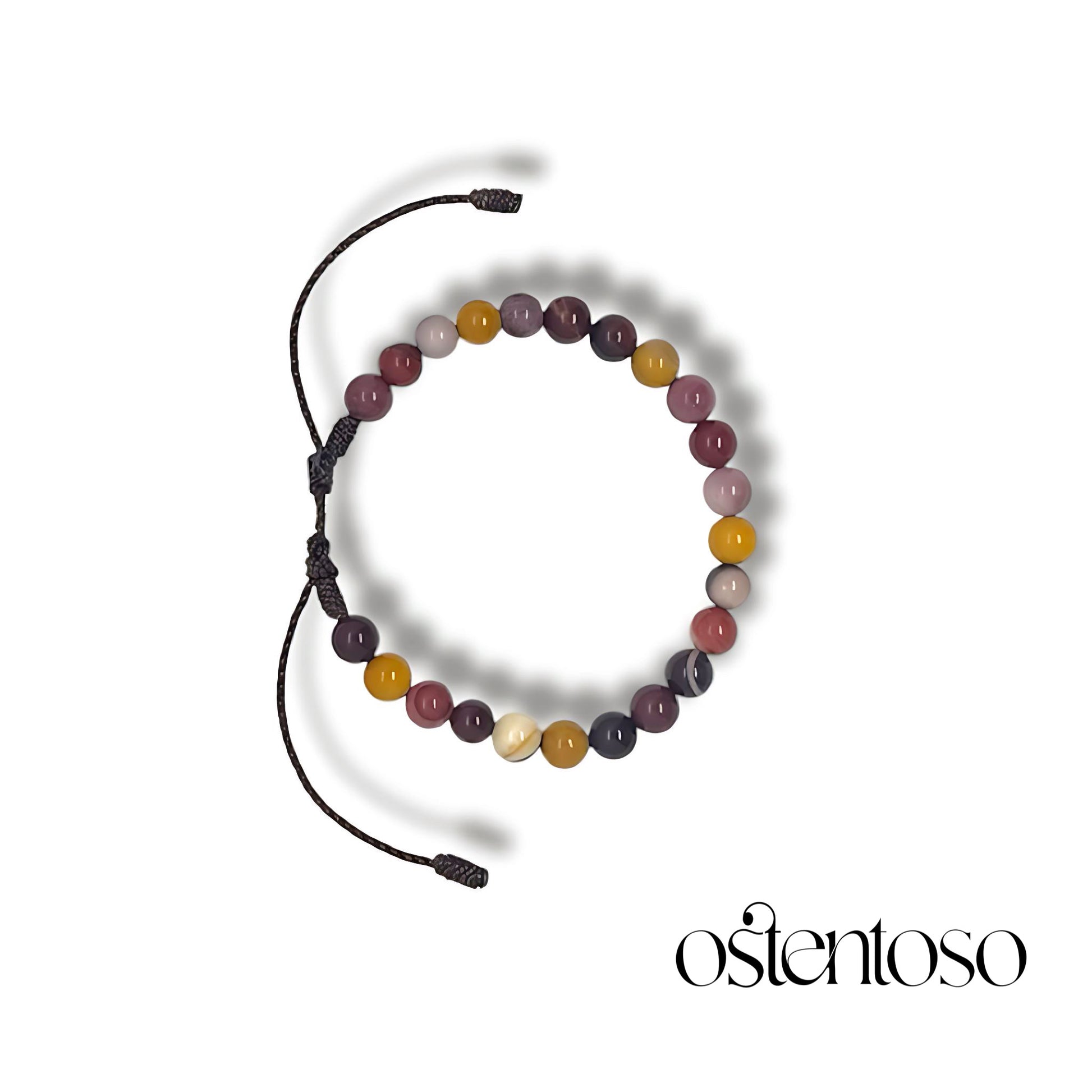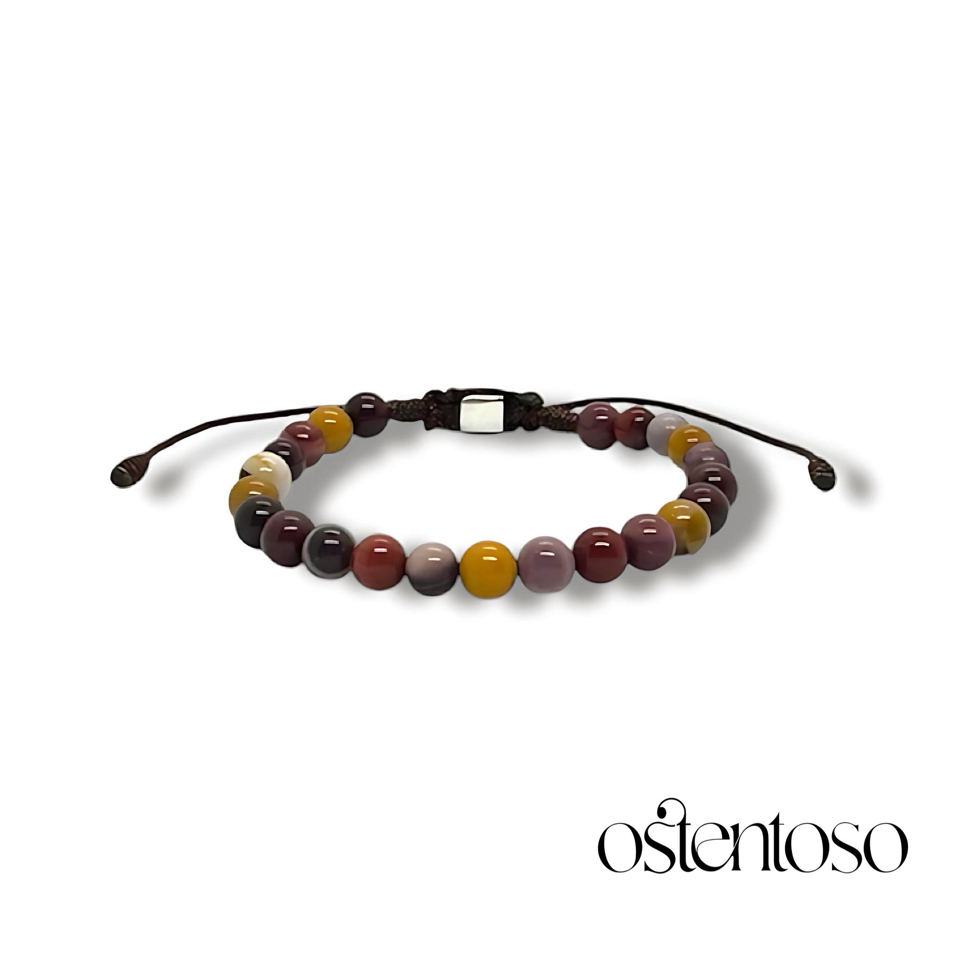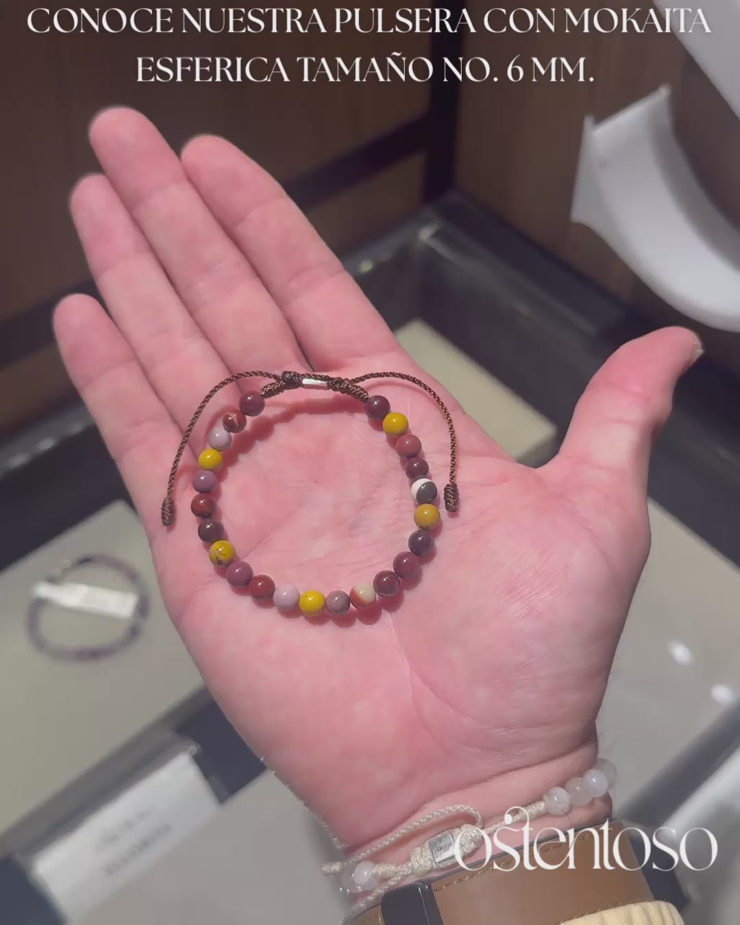 Magnifique Bracelet réalisé avec des roches Mokaite semi-polies taillées en forme sphérique, taille n°6 mm, conçu avec ses versions Basic et avec des perles en or 18 carats, et corde terlenka colorée selon le design. Le rocher Mokaita a des tons de terre multicolores, qui mettent en valeur sa beauté ; On retrouve dans ses coupes des couleurs comme le jaune, le marron, le rouge et le blanc.