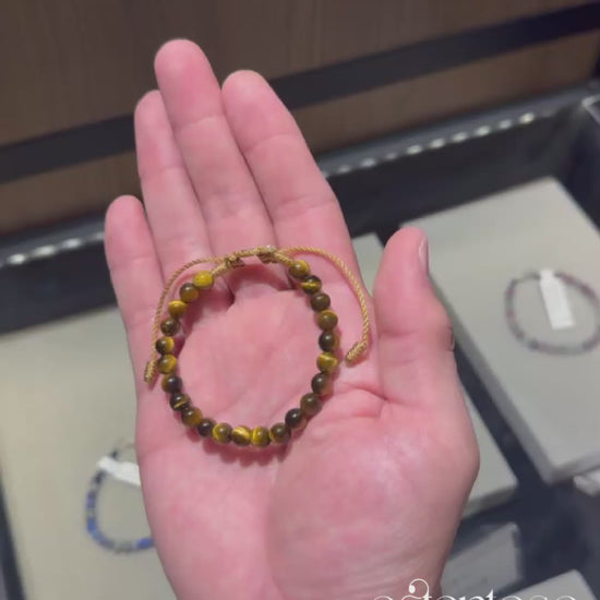Notre magnifique bracelet est composé de pierres Oeil de Tigre dorées et polies taillées en forme sphérique polie de taille n° 6 mm, conçues dans ses versions Basic et avec une balle en or 18 carats, et une corde terlenka colorée selon le design.