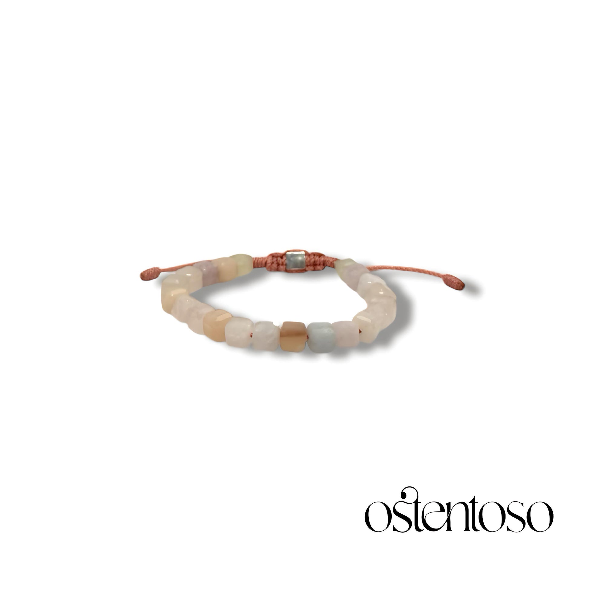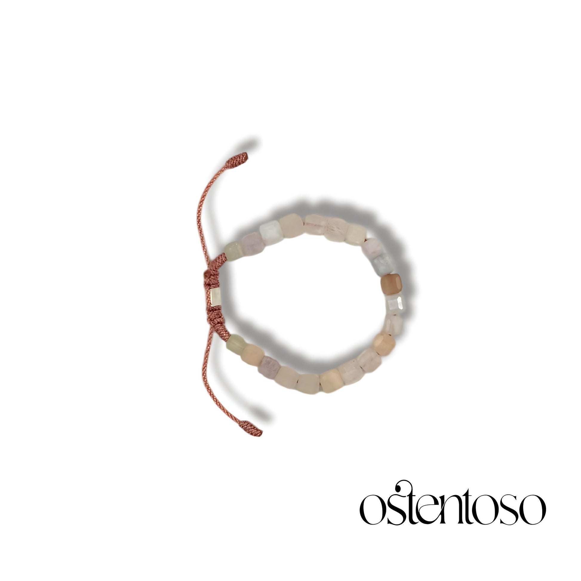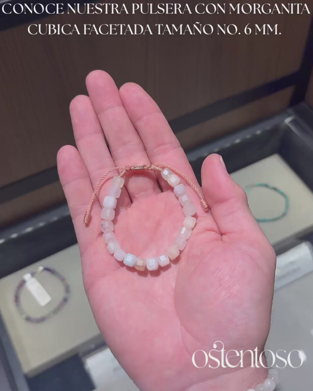 Notre magnifique bracelet est réalisé avec des cristaux minéraux Morganite, un type de Béryl à l'aspect acide taillé en forme cubique polie de taille n°6 mm, conçu avec ses versions Basic et avec une boule en or 18 carats , et une corde terlenka de couleur selon le design. .