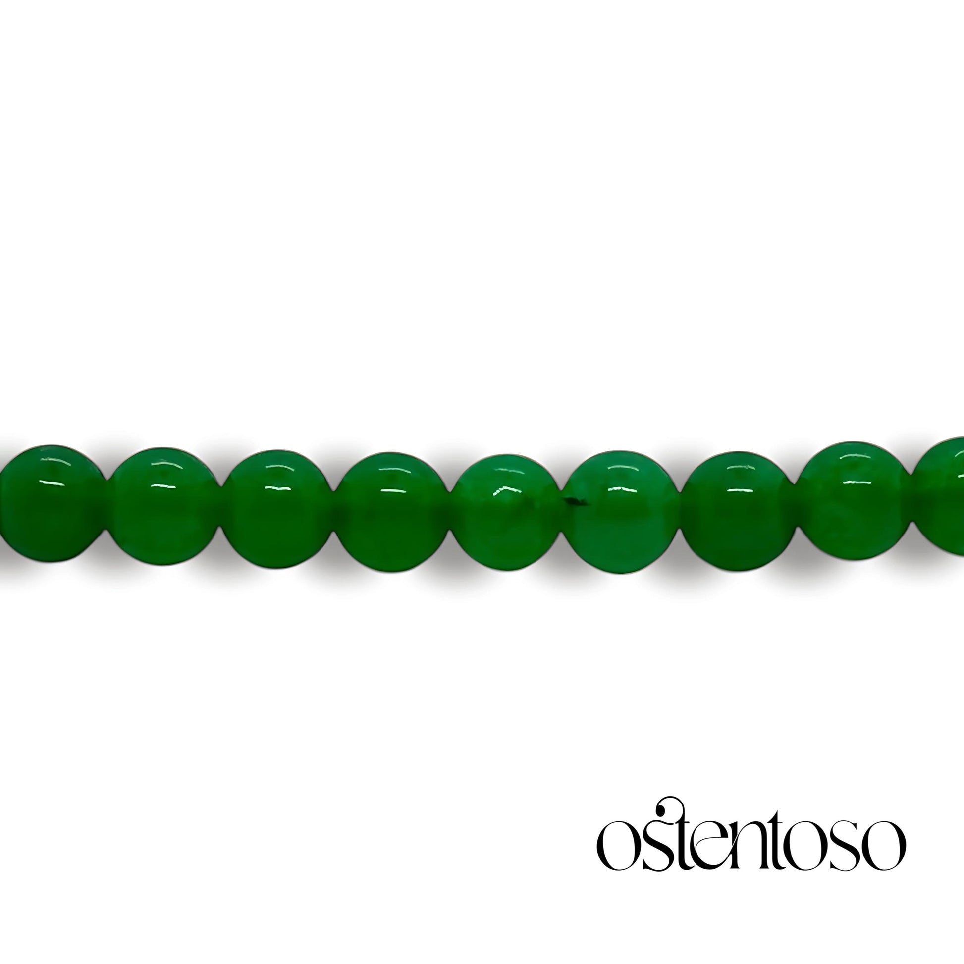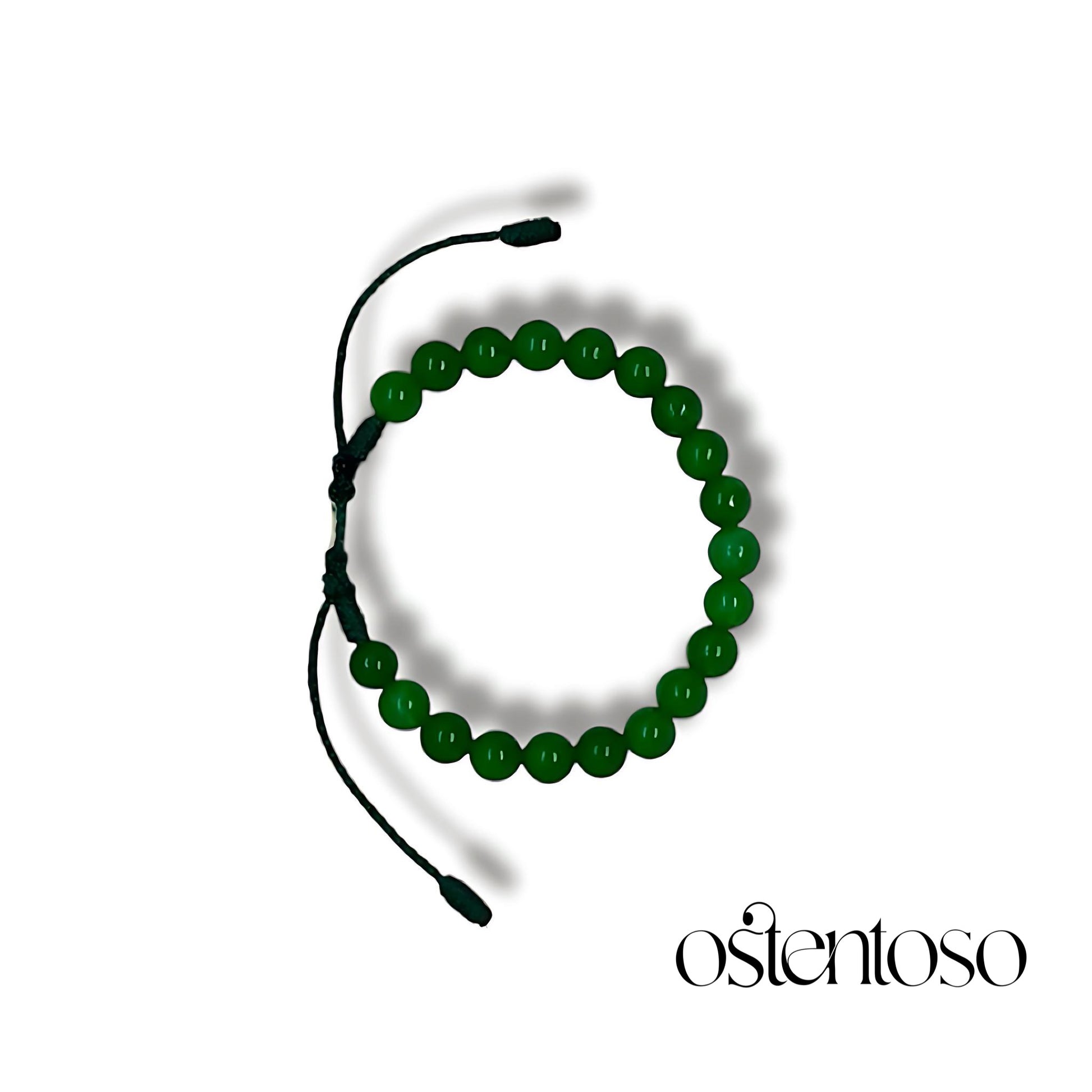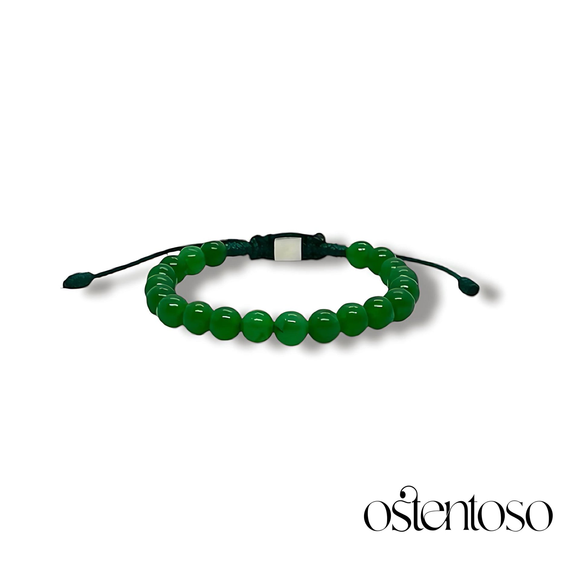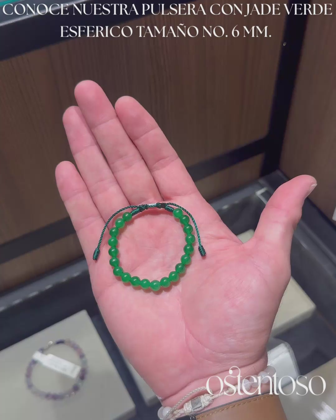 Notre magnifique bracelet est composé de cristaux de Jade vert naturel taillés en forme sphérique polie de taille n° 6 mm, conçu avec ses versions Basic et avec une boule en or 18 carats et une corde terlenka colorée selon le design.