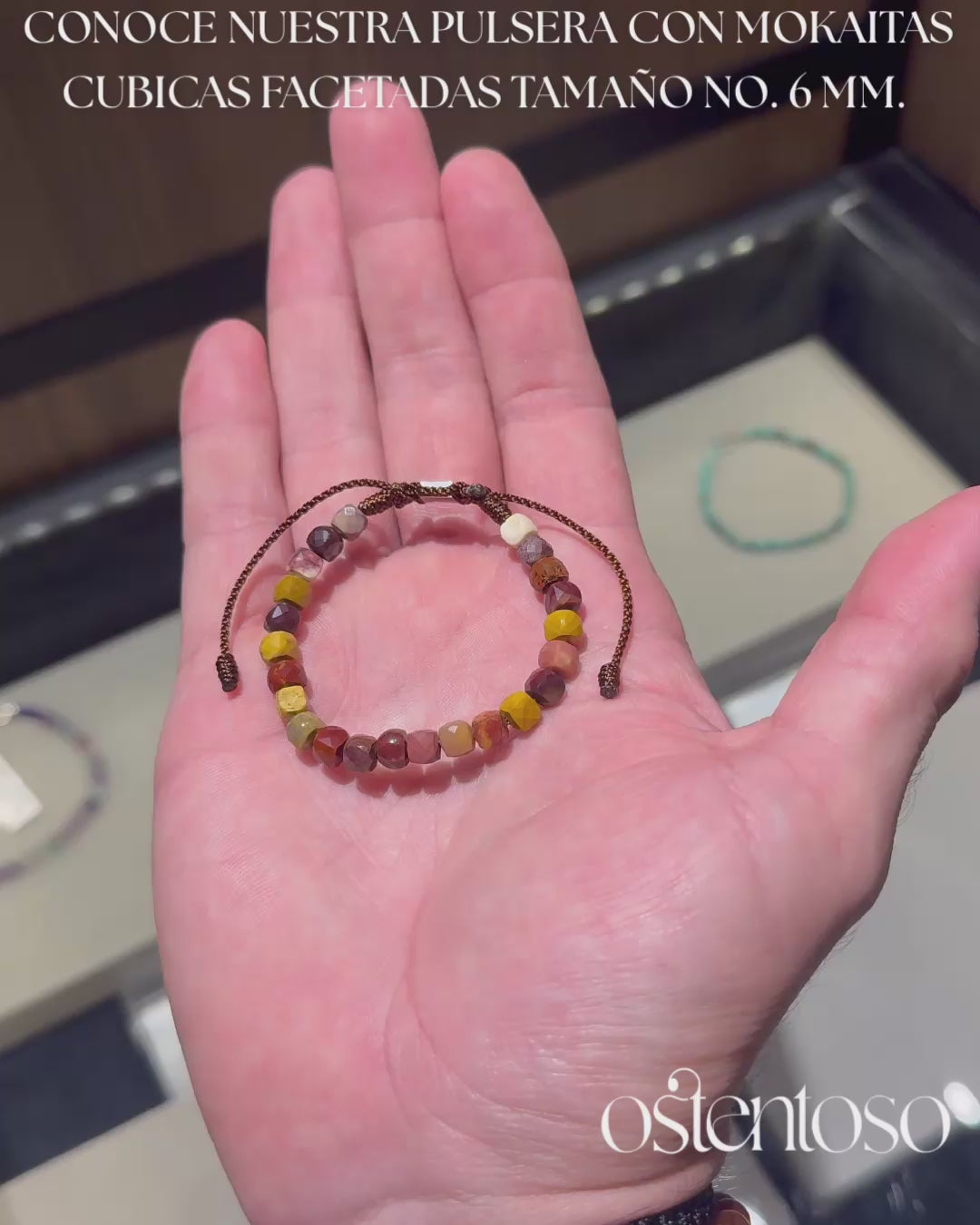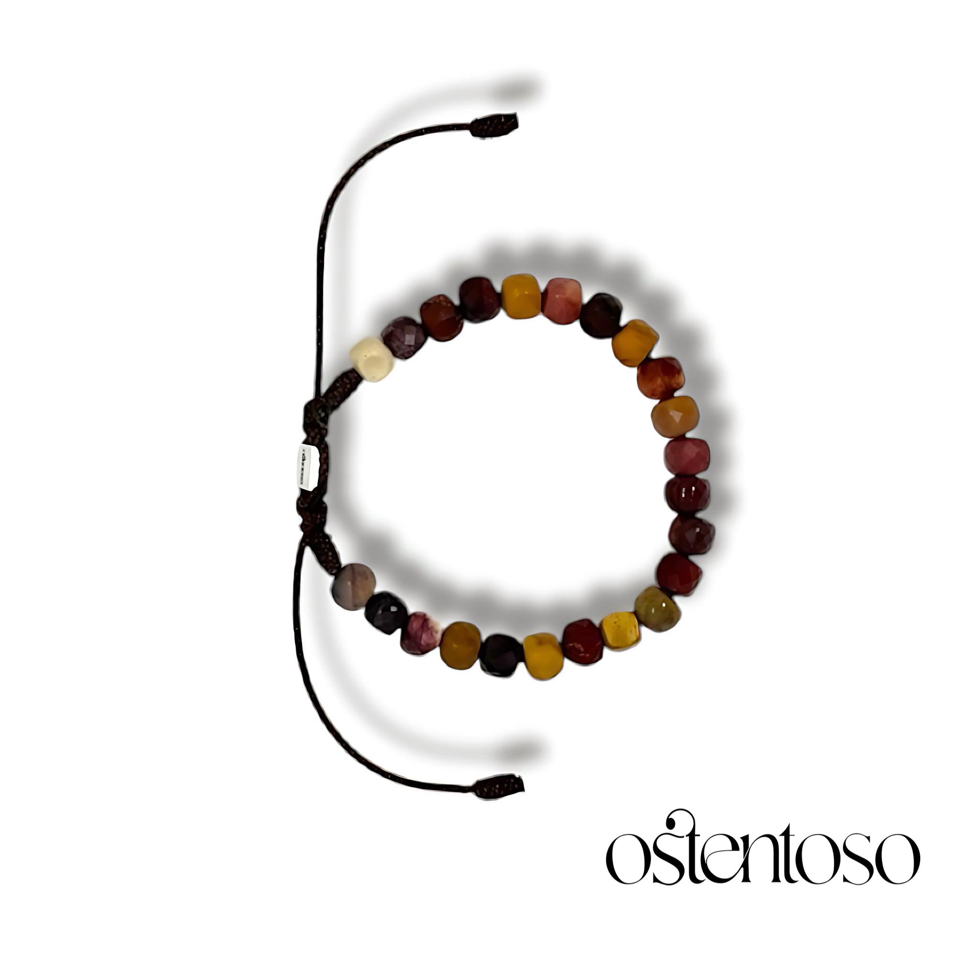 Ce magnifique Bracelet réalisé avec des roches Mokaite semi-polies taillées en forme cubique taille n°6 mm, conçu avec ses versions Basic et avec boule en or 18 carats , et corde terlenka colorée selon le design.