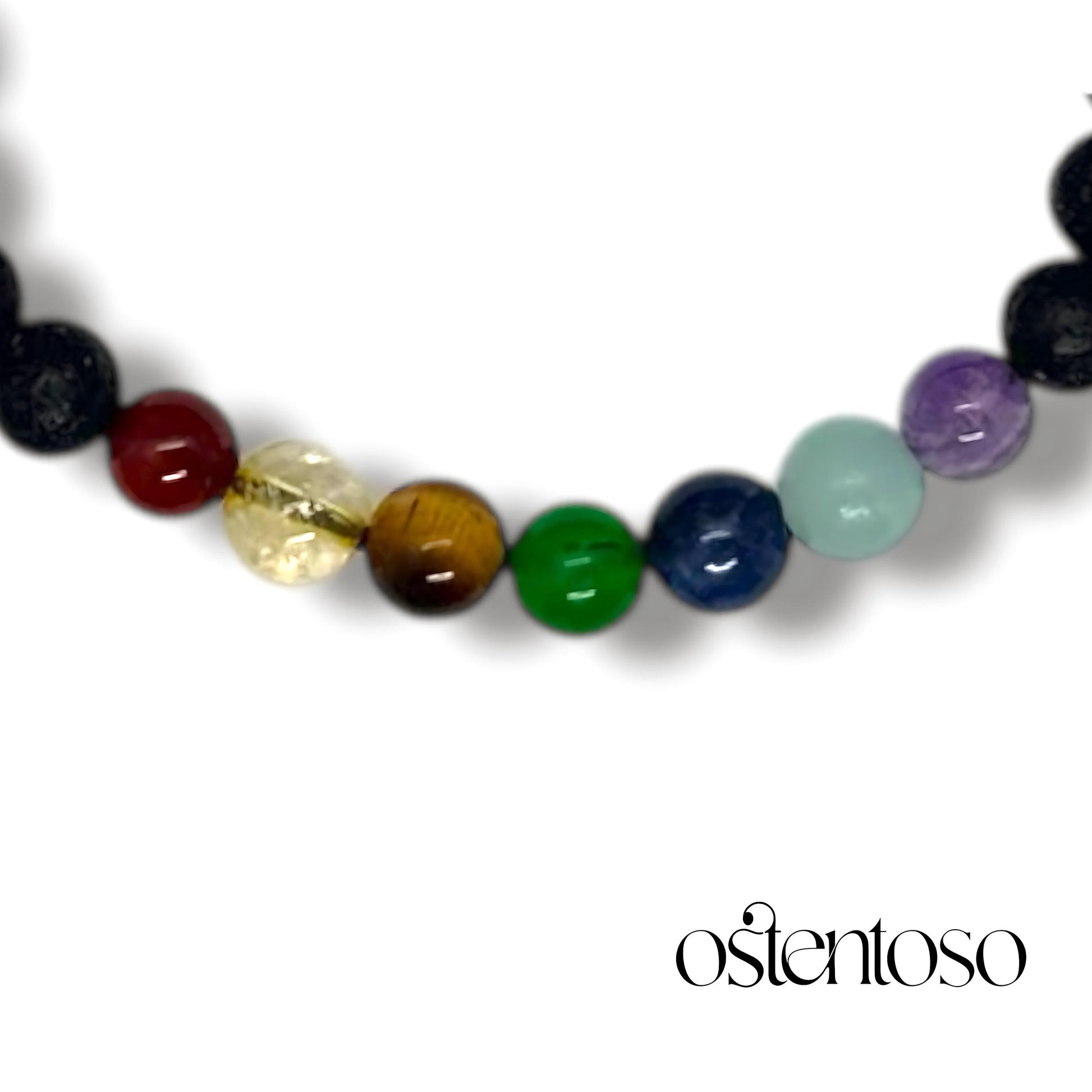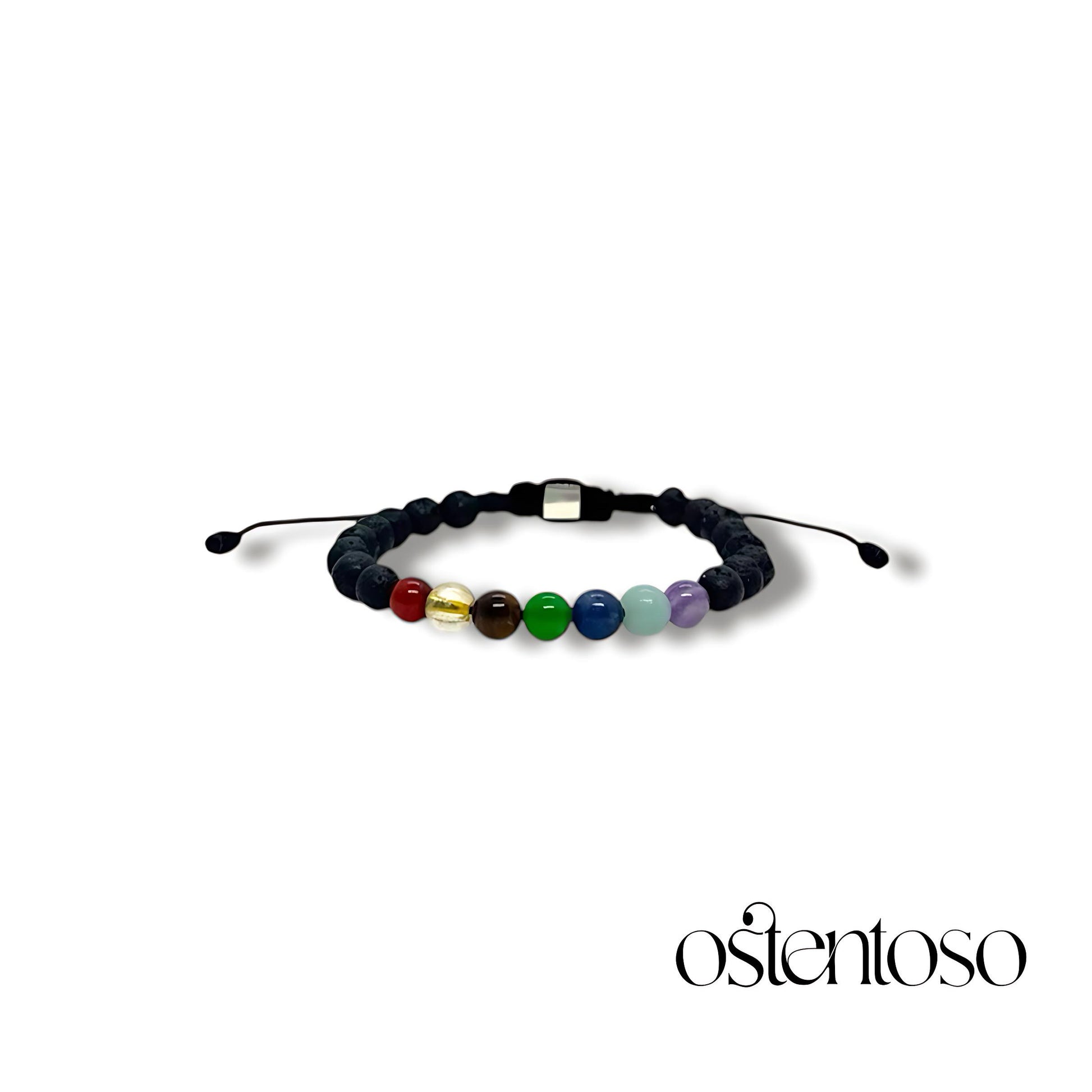 Ce modèle de bracelet à sept chakras est composé de roche volcanique et au centre du bracelet l'ordre exact et les pierres précieuses qui mettent en valeur ce rituel :